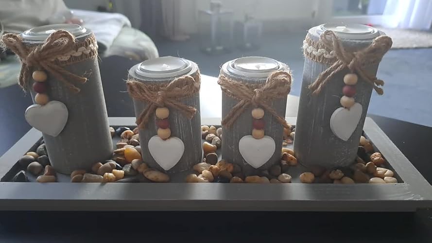 Bougeoir en bois gris clair, Photophore, Porte bougie, Chandelier Description générale Ce très joli bougeoir en bois gris clair, composé de 5 pièces et 5 petits cœurs accrochés, apportera une ambiance très cosy à votre pièce, que ce soit dans le salon, la salle de séjour ou la chambre. Le support en forme de plateau rectangulaire est pratique et facile à placer sur une table ou un meuble Bougeoir Plateau Rectangulaire Bougeoir, Photophore, Porte Bougie, Chandelier, Centre De Table Décoration Cosy Salon Porte-bougie Chandelier en métal doré 26x26x51 cm - - Dimensions: Longueur 38,7 x largeur 11,7 x Hauteur 12,5 cm - Ce très joli Bougeoir en bois composé de 5 pièces et 5 petits coeurs accrochés apportera une ambiance très cosy à votre pièce, salon, salle de séjour chambre….