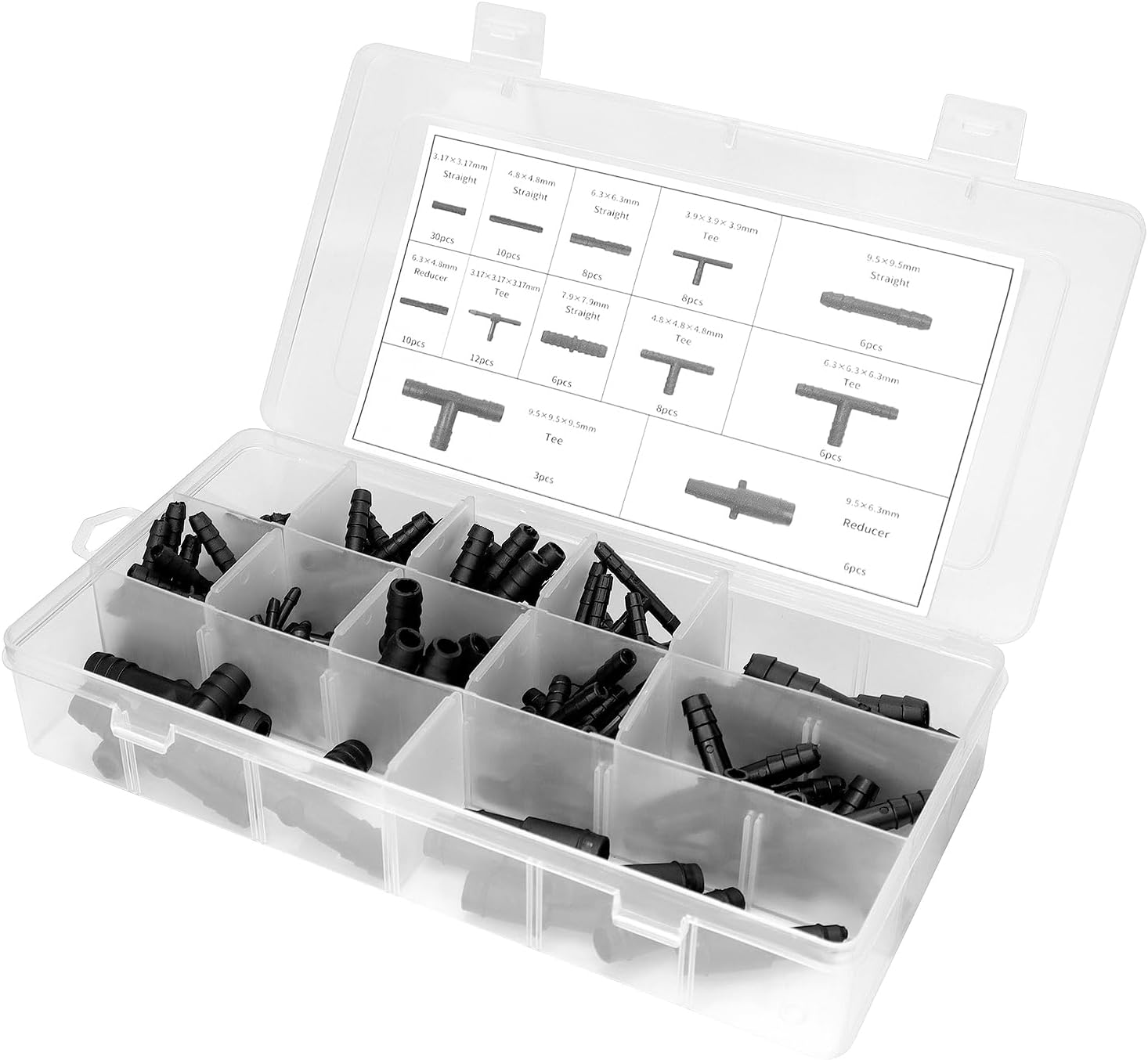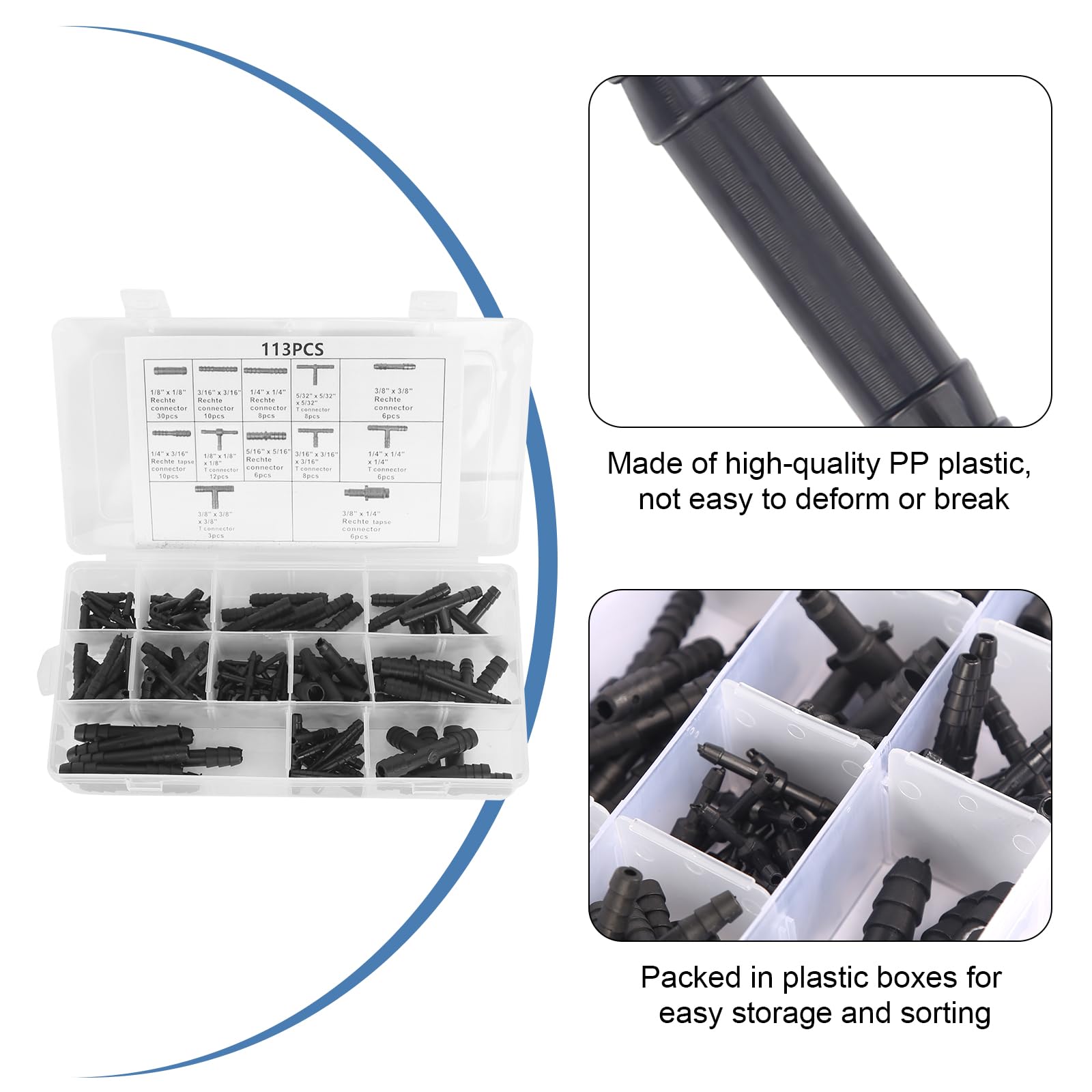 Cette boîte non seulement facilite le stockage et la protection de vos connecteurs, mais elle aide également à maintenir l'ordre dans votre atelier, garage ou cabanon de jardin. Assortiment de 113 raccords de tuyaux - raccord en T noir - ensemble de raccords de tuyaux - ensemble de réducteurs - accessoires - raccordement simple de tuyau... Pour une installation encore plus aisée, vous pouvez tremper les pièces dans de l'eau tiède quelques minutes pour les rendre plus flexibles et faciles à manipuler. Que vous soyez un jardinier passionné, un professionnel de l'automobile ou simplement à la recherche d'une solution fiable pour vos tuyaux à la maison, cet ensemble est. Connecteurs Tuyau QWORK® Enseble De Connecteurs De Tuyau De 113 Pièces - 12 Tailles De Pièce Droite Et Réducteur Adaptateur Robinet Tuyau Arrosage Matériaux de Haute Qualité: Fabriqués en nylon noir renforcé de fibre de verre, ces connecteurs de tuyau offrent une durabilité exceptionnelle et une résistance à la pression de l'eau, garantissant une utilisation longue durée sans fuite ni corrosion. Découvrez la solution ultime pour tous vos besoins en matière de connexion de tuyaux avec notre ensemble de connecteurs de tuyau de 113 pièces. Il contient 37 connecteurs en T, 60 connecteurs droits et 16 réducteurs, couvrant une large gamme d'applications domestiques et professionnelles. Applications Polyvalentes: Idéal pour une variété d'utilisations, y compris les systèmes d'irrigation de jardin, les tuyaux d'arrosage, les systèmes de lave-glace de véhicules et les installations de goutte à goutte. Une solution universelle pour connecter des tuyaux de différentes tailles et types. Sans nécessité d'outils spéciaux ou de colle, vous pouvez assembler votre système rapidement et efficacement. En plus de sa fonctionnalité supérieure, cet ensemble est livré avec une boîte de rangement pratique. Robinet CYGNUS à raccord rapide avec raccord de tuyau pour composants de jardin universels... Cette composition robuste garantit une étanchéité et une longévité accrue, vous permettant de profiter d'un système sans fuite ni maintenance fréquente. Rangement et Organisation Faciles: Livré avec une boîte de rangement pratique qui facilite le stockage et la classification de vos connecteurs. Tuyau et embouts universels pour gonfleur