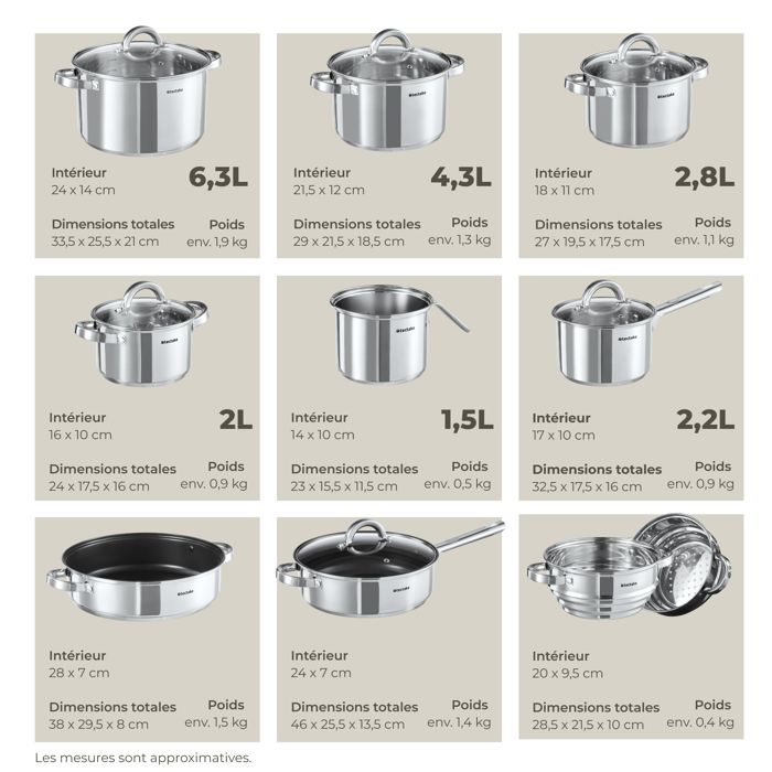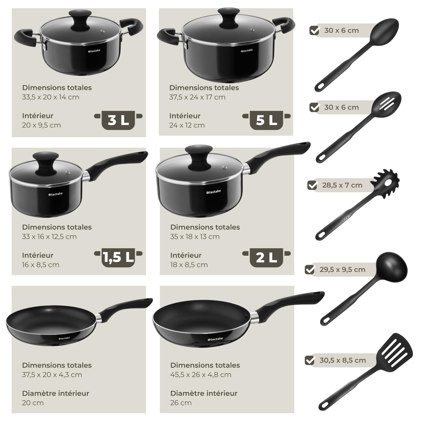 Les fonds spiralés assurent une répartition de la chaleur, garantissant une cuisson rapide et uniforme, idéale pour les cuisinières à gaz, électriques ou vitrocéramiques. tectake® Service de table pour 6 personnes, 30 pcs, Petites Dimensions intérieures : 18 x 8,5 cm, Volume : 2 L, Poids : 900 g Louche : 29,5 x 9,5 x 5,5 cm Les couvercles permettent une libération régulière de la vapeur pour des plats parfaitement cuits, tandis que l'ergonomie des ustensiles améliore la sécurité en cuisine, idéal pour une utilisation au quotidien. Petite poêle : Dimensions : 37,5 x 20 x 4,3 cm CONÇU POUR UNE LONGÉVITÉ EXCEPTIONNELLE ET UN NETTOYAGE PRATIQUE - Le service vaisselle en grès émaillé et la batterie de cuisine inox sont conçus pour durer. UN SERVICE DE TABLE COMPLET POUR 6 PERSONNES - Ce set de cuisine offre un service de table de 24 pièces, incluant 6 grandes assiettes plates, 6 petites assiettes, 6 assiettes creuses et 6 bols, parfait en famille ou entre amis. Chaque pièce est fabriquée en grès robuste, émaillée pour une meilleure durabilité et facile à empiler. Compatible micro-ondes et lave-vaisselle. Un kit... Données techniques et Contenu de la livraison : 6 Grandes assiettes Dimensions : 26 x 2,3 cm, Poids : 860 g Grande poêle : Dimensions : 45,5 x 26 x 4,8 cm Compatible micro-ondes et lave-vaisselle. Parfait pour préparer des repas savoureux, ce kit est l’allié idéal pour les repas de tous les jours comme pour les occasions spéciales. 6 Bols Dimensions : 15 x 7,4 cm, Poids : 550 g Service De Table 12 Personnes Tectake® Set De Cuisine 39 Pièces, Service De Table 6 Vaisselle Et Ustensiles Cuisine Tout-en-un Diamètre intérieur : 20 cm, Poids : 400 g Matériau : plastique bakélite, Notice d’utilisation Dimensions intérieures : 16 x 8,5 cm, Volume : 1,5 L, Poids : 700 g Un kit vaisselle et arts de la table indispensable. Il comprend poêles, casseroles, une grande marmite, ainsi que des ustensiles de cuisine pratiques comme une spatule cuisine, une louche et une cuillère à spaghetti. 6 Assiettes creuses Dimensions : 20,5 x 5,2 cm, Poids : 550 g Dimensions intérieures : 24 x 12 cm, Volume : 5 L, Poids : 1400 g Chaque pièce est fabriquée en grès robuste, émaillée pour une meilleure durabilité et facile à empiler. BATTERIE CUISINE INOX EN ALUMINIUM - Cette batterie de cuisine comprend 15 pièces, dont des casseroles, poêles et sauteuses, en aluminium inoxydable avec revêtement antiadhésif pour une cuisson sans effort et un nettoyage simplifié. Dimensions intérieures : 20 x 9,5 cm, Volume : 3 L, Poids : 1100 g Cuillère de service : 30 x 6 x 4 cm Vaisselle Tectake Set de cuisine pour 6 personnes avec vaisselle et casseroles en grès émaillé noir/taupe - Set de cuisine complet au style urbain pour une base parfaite - Poignées en plastique résistantes à la chaleur et couvercles en verre avec orifice d'évacuation de la vapeur - Service de table de 24 pièces, empilable, adapté au micro-ondes, en grès robuste avec émaillage... Inclus également des couvercle casserole.