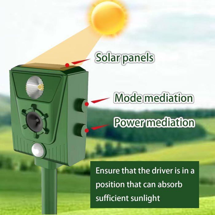 Beiping-Répulsif ultrasonique solaire de Animal Oiseau Chat Chienpour Idéal pour les parterres de fleurs, potagers, campings, camping-et véhicules, il offre une protection polyvalente là où c'est nécessaire. Défense Potager Bio Gufo Scaccia Piccioni Répulsif Ultrason Solaire Animaux - Chat, Chien, Taupe - 5 Modes - Jardin Répulsifs Pour Chats Repulsif Ultrason Chien Cet appareil de dissuasion éloigne efficacement les chiens, écureuils, lapins et autres intrus autour de votre maison, clôture, pelouse, piscine ou poulailler. Vvikizy Répulsif pour animaux Répulsif à Ultrasons d'Animaux Expulseur... VINGVO Répulsif animal solaire pour oiseaux, boîte vocale solaire... Protection complète : Protège les espaces extérieurs incluant jardins, terrasses, fermes et cours grâce à une application versatile. Performance Solaire Fiable: Conception avec capteur solaire haute efficacité un fonctionnement écologique continu et cohérent malgré les changements d'exposition au soleil tout au long de la journée. Traite plus de trente types d'animaux pour une solution antiparasitaire intégrée. Avec des caractéristiques étanches et résistantes aux intempéries IPX4, il sécurise les jardins, fermes, cours et terrasses. Protection anti-poussière/humidité : Structure étanche spécialement conçue pour les environnements rigoureux, bloquant efficacement poussières et eau afin d'assurer une utilisation extérieure durable sans altérer performance ou fiabilité du solaire. La recharge solaire garantit une alimentation fiable pour ce ultrasonique animal, conçu pour protéger vos espaces extérieurs.