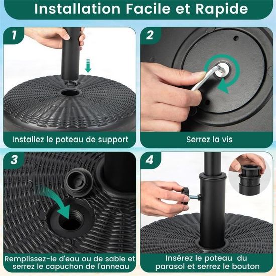 Grâce aux 2 adaptateurs, elle s'adapte à la plupart des parasols de table et déportés. 【Remplissage d'Eau ou de Sable】La base de parasol remplissable est livrée avec un sac à lester qui peut être rempli de 55 L d'eau ou de 80 kg de sable, gardant votre parasol droit par temps venteux. Et il convient aux mâts de parasol de terrasse d'un diamètre de mât de 38/48 mm. Construit en HDPE et en tube métallique antirouille, elle peut résister à toutes les intempéries. Pied de parasol carré en terre cuite et blanc 12 kg | Leroy Merlin De plus, elle est équipée d'un plateau de table pour garder les boissons et les collations à portée de main. Le sac à lester inclus peut être rempli de 55 L d'eau ou de 80 kg de sable pour la stabilité. COSTWAY Pied de Parasol Carré, Base de Lestage en HDPE avec 4 Roues Universelles Verrouillables... De plus, il existe 2 boutons fixes réglables pour fixer fermement le parasol, évitant ainsi toute oscillation. Elle dispose d’un plateau de table amovible pour contenir vos collations. 【S'adapte à Différentes Tailles de Parasols】Le support de parasol est équipé d'un poteau de support en métal et de 2 adaptateurs, qui peuvent accueillir la plupart des parasols de 180/210/250/270/300 cm et des parasols déportés de 270/300 cm. Pied De Parasol Balcon Pied De Parasol Carré, Base De Parasol En HDPE Avec Plateau De Table Roues Et Poignees Support De Parasol Charge D Eau Sable 53 X 53 X 45cm 680b5868569edd7a9eeffc6d Pied Parasol Carré Avec Plateau Descriptif technique ; Carré · Dimensions globales : 53 x 53 x 45 cm (L x l x H) Taille de la jardinière : 53 x 53 x 30 cm (L x l x H) Taille du plateau de table... Mais le plateau de table ne convient que pour les mâts de parasol de 38 mm.