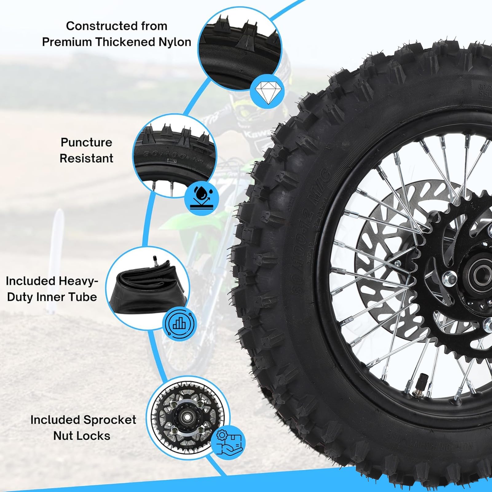 Roue Arrière Moto Tout-terrain Roue Arrière De 40,6 Cm Avec Rotor De Frein Et Pignon 428 Pour Moto Tout- Terrain 90/100-16 125 Cc 140 Cc 150 Cc Apollo RXF 150 SSR XR CRF TaoTao (40,6 Cm Pneu 80/100-10 Essieu 12mm Description :Jante arrière Dirt Bike 10'' OR (type 2), Jantes Axes et Avec un pneu de roue arrière 80/100 10 3.00 10, un de 12 mm, un rotor de frein de 190 mm et un pignon de 420 41t, il offre une mise à niveau polyvalente et fiable pour diverses conditions de conduite. [Convient aux motos tout-terrain] Conçu spécifiquement pour... [Kit de mise à niveau complet] Cet ensemble complet de roue arrière comprend tout ce dont vous avez besoin pour une installation facile. Avec un pneu de roue arrière 80/100 10 3., 00 10, un de 12 mm, un rotor de frein de 190 mm et un pignon de 420 41t, il offre une mise à niveau polyvalente et fiable pour diverses conditions de conduite. Ce design garantit une excellente traction et performance que vous naviguiez sur des chemins rocailleux ou des sentiers boueux, offrant une durabilité inégalée. La construction en caoutchouc de haute qualité garantit une performance durable sur divers terrains, ce qui le rend idéal pour les pilotes aventureux à la recherche de fiabilité. Assurez-vous de la compatibilité avec la taille de votre roue avant d'acheter, car cet assemblage pas adapté aux essieux de 15 mm. [Adapté aux motos tout-terrain] Conçu spécifiquement pour les motos tout-terrain de 50 ml et 110 ml, cet assemblage de pneu et de jante intérieure garantit un ajustement précis. Compatible avec les roues de mini-moto, il offre une intégration parfaite et une stabilité améliorée pour une expérience de conduite fluide et contrôlée. Jante arrière 10 po - Liberta Canada