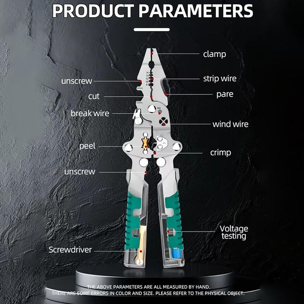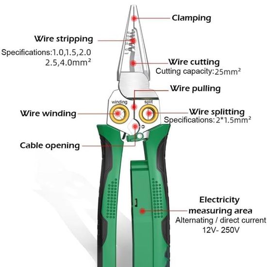 Pince à Sertir Professionnelle RJ45 Outil Sertissage RJ45 Cat 7 Avec Prise Cat6 Rj45 Et Connecteur Rj45 85482317 Outil électrique 8 En 1 Pince à Dénuder Professionnelle 8 En 1 - Outil électrique Multifonction Pince A Denuder Pince multimètre numérique, pince multimètre de tension, pince... * Design robuste : fabriqué à partir de matériaux robustes, cet outil est conçu pour durer et peut gérer efficacement la coupe, le dénudage et la traction des fils, ce qui le rend fiable pour les tâches électriques exigeantes. Cette pince 8 en 1 isolée multifonction pour électricien est conçue pour répondre à divers besoins lors de travaux électriques. Elle permet de sertir, dénuder... * Poignée ergonomique confortable : doté d'une poignée ergonomique qui minimise la fatigue de la main, cet outil assure une prise en main sûre et confortable, permettant un contrôle précis et un fonctionnement fluide lors d'une utilisation prolongée. *Polyvalent pour différentes tailles de fils : le design 8 en 1 s'adapte à une large gamme de jauges de fil, performance optimale pour les applications lourdes et légères, permettant des coupes et des bandes précises à chaque fois.