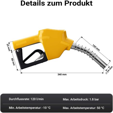 【Polyvalence et Compatibilité】: Ce produit est équipé de raccords de 1 pouce et 3/4 pouce, adaptés à des ouvertures de réservoir de différentes tailles, ce qui augmente sa flexibilité d'utilisation. Raccords 1 Pouce 3/4 Pouce Inclus Pistolet Automatique Diesel,Pistolet Pompe à Diesel/Carburant De Voiture, Pompe à Fioul Automatique,Pompe D'aspiration D'huile,3/4 Pistolet Ravitaillement Débit Réglable Ce pistolet de ravitaillement automatique en diesel est fabriqué en alliage d'aluminium et en plastique ABS et convient au diesel, à l'essence et au kérosène. Buse Pulvérisatrice DANFOSS Type S 60º 0,55 Gallons - 2,11kg/h Gicleurs... Le pistolet de ravitaillement s'arrête automatiquement lorsque le réservoir est plein, ce qui évite le gaspillage de carburant et les débordements. 【Longévité】: La pompe à essence auto-amorçante de type 11A est composée d'une combinaison d'alliage d'aluminium et de plastique ABS, qui est non seulement résistante à la corrosion, mais aussi à certaines contraintes physiques, garantissant ainsi une longue durée de vie. Buse de Carburant Automatique]: La buse d'alimentation en carburant et le raccord rotatif conviennent aux tuyaux de carburant de 1 pouce ou 3/4 pouce et... Ils sont principalement utilisés pour remplir les réservoirs de carburant des véhicules à moteur ou pour vidanger le diesel et l'huile des réservoirs. Il est équipé d'un dispositif anti-débordement à fermeture automatique, offre un débit élevé et une grande résistance aux intempéries. 【Fonction d'Arrêt et de Verrouillage Automatiques】: Le système d'arrêt automatique empêche le débordement et minimise le risque de fuites lors du ravitaillement. Wiltec Pistolet de distribution avec système d’arrêt 【Buse de Carburant Automatique】: La buse d'alimentation en carburant et le raccord rotatif conviennent aux tuyaux de carburant de 1 pouce ou 3/4 pouce et offrent une bonne étanchéité pour éviter les gouttes ou les fuites de carburant. Comme dans une station-service, ce pistolet de ravitaillement s'arrête automatiquement.