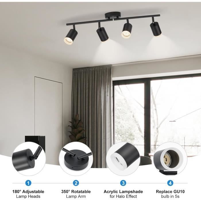 Plafonnier Led, 4 Spots Pivotants, Avec Ampoules Led Gu10 3W 250Lm... Facile à Installer : Tous les accessoires et les instructions sont fournis pour un montage rapide du plafonnier chambre au mur ou au plafond ; sa visière de la tête de lampe est amovible, vous permettant de choisir librement un éclairage doux ou brillant Application Large : Le design épuré et moderne de l'éclairage de plafond s'adapte à différents espaces tels que le salon, la cuisine, la salle à manger, la chambre, le couloir, l'escalier ou le bureau, apportant une touche esthétique raffinée Plafonnier Cuisine Plafonnier Led 4 Spots Orientables, Plafonniers Avec 4 X 4W Ampoule E14 éclairage Salon Cuisine Chambre Rotation Flexible : Chaque spot de ce luminaire plafonnier est rotatif à 340° horizontalement et à 90° verticalement, permettant d'éclairer différentes zones de la pièce pour créer un éclairage personnalisé et directionnel Rotation Flexible : Chaque spot de ce luminaire plafonnier est rotatif à 340° horizontalement et à 90° verticalement, permettant d'éclairer différentes... 1 Cuisine 2 Appartement 3 Chambre à coucher 4 Couloir Plafonnier LED 4 Spot, Spots de plafond Plafonnier Pivotants