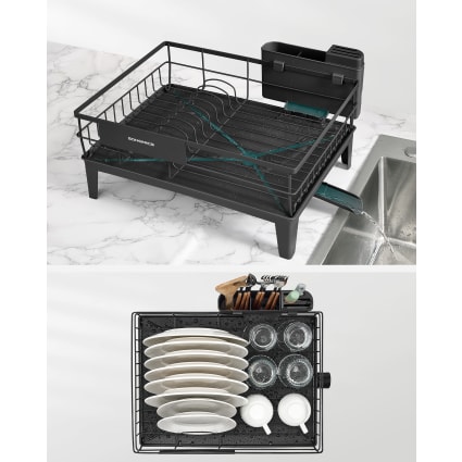 Pour la plus part de familles : D’une taille compacte de 31 x 42 x 36,5 cm, ce support d’assiette est parfait pour une famille de 2 à 4 personnes. SONGMICS Égouttoir à Vaisselle, 2 Niveaux, Organisateur de Plan Travail, Bec Rotatif 360 et Extensible, Bac d'Égouttement, Porte Couverts, 31 x 42 36,5 cm, Noir... Les éléments en plastique PP sans BPA assurent une utilisation en toute sécurité Porte-couverts amovible : Il permet de ranger facilement les cuillères, couteaux, fourchettes et petits ustensiles de cuisine. égouttoir Vaisselle 2 Niveaux Égouttoir à Vaisselle, Organisateur De Plan De Travail, Bec Rotatif à Porte-couverts Amovible égouttoir Antirouille et sûr : Fabriqué en acier avec une surface traitée par poudrage, cet organisateur de cuisine est conçu pour résister à la rouille et à la déformation. Points forts de cet égouttoir à vaisselle en bref : Drainage efficace : Grâce à son bec extensible rotatif à 360°, l’eau s’évacue facilement dans l’évier, et le bac d’égouttement incliné assure un drainage rapide. Il peut contenir 10 assiettes, des bols et des verres, optimisant l’espace de votre cuisine Assemblage facile : Grâce à sa structure simple, cet égouttoir est facile à assembler sans outil ni vis. Emboîtez les pièces ensemble et vous pourrez l’utiliser en un rien de temps ! Assemblage simplifié : Sa structure simple ne nécessite ni outil ni vis pour son installation. Drainage efficace : Cet égouttoir est doté d’un bec extensible rotatif à 360°, permettant à l’eau de s’écouler dans l’évier depuis n’importe quel côté. Égouttoir 2 niveaux et couverts Acier de qualité : Fabriqué en acier traité par poudrage, il évite la rouille et la déformation. Porte-couverts pratique : Cet égouttoir pour plan de travail comprend un porte-couverts amovible avec 3 compartiments, qui vous permettent de ranger les cuillères, les fourchettes et autres ustensiles, et peuvent être utilisés séparément Égouttoir à Vaisselle SONGMICS 2 Niveaux - Acier Inoxydable