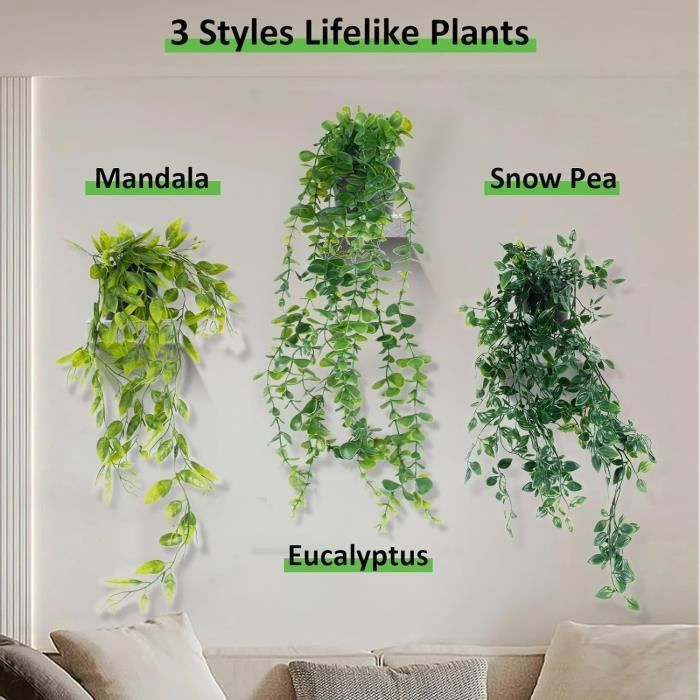 ENSEMBLE DE PLANTES ARTIFICIELLES À SUSPENDRE : 3 pièces de plantes vertes artificielles à suspendre, dont un eucalyptus artificiel de 56 cm... Vous pouvez les accrocher aux murs, aux portes, aux jardins, aux balcons, aux cafés, aux escaliers et ailleurs [Emballage] Notre plante artificielle interieur contient trois types de mandarines + cosses de pois + eucalyptus court, chaque type de verdure est livré avec 9 fourches de différentes longueurs ; trois styles différents de plantes, afin que vous puissiez décorer pour un meilleur look Décoration Intérieure Extérieure Verte SLDHFE Plantes Artificielles Interieur, 3 Pièces, Plante Fausse Plante Interieur Il suffit de l'essuyer doucement avec une serviette Plante Artificielle Tombante, 2 Plantes Artificielle avec Pots, Plantes artificielles Interieur... [Matériau de qualité] Notre plantes artificielles interieur sont des plantes artificielles en pot, en plastique de haute qualité, bien faites, avec des couleurs naturelles et fraîches ; elles ne se flétrissent pas facilement et ont une longue durée de vie Plante Artificielle Tombante - 3Pcs Plantes Artificielles Avec Pots Interieur Exterieure Decoration Vert Faux Lierre Suspendue 90964759