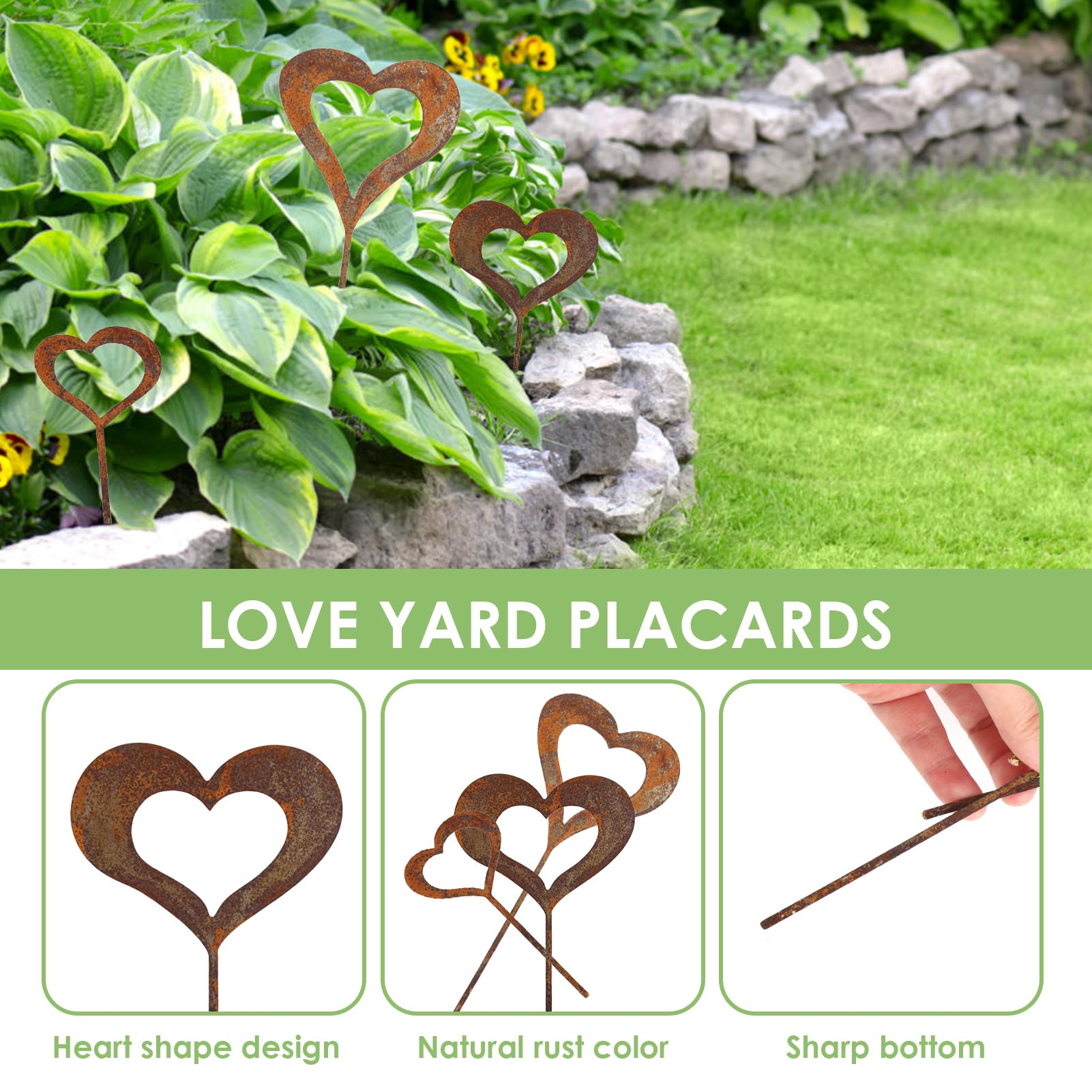 Cœur funéraire en forme de cœur avec rose - Décoration asymétrique - 20 * Dimensions : 140 x 80 mm, 200 x 78 mm et 107 x 50 mm., Couleur : voir photo. Déco Extérieure Balcon WE26475-Support De Plantes De Jardin En Forme De Cœur. En Fer Fer Rouillé Effet Vintage * Matériau ferme : fabriquées à partir de fer robuste, ces décorations sont conçues pour résister aux éléments, assurant une beauté durable dans n'importe quel environnement extérieur. Aspect rustique unique : chaque piquet dispose d'une finition rouillée distincte créée par des processus de vieillissement naturel, chaque pièce est d'une... ensemble de pastel rose et menthe vert papercut 3d cœur forme Cadre... [Individualité avec détails rouillés] Chaque pièce dispose d'une finition rouillée unique qui évolue au fil du temps, garantissant que votre décoration se distingue par son caractère unique en son genre. Nombre de pièces : 3., Contenu de l'emballage : 3 x poils de décoration de jardin en fer rouillé Utilisation polyvalente : pour améliorer la beauté du jardin ou servir de marqueurs significatifs pendant les moments spéciaux, ajoutant de la chaleur et de la sentimentalité où que vous soyez. * Finition rouille unique : chaque piquet de jardin présente un aspect rouillé distinctif en raison du naturel au fil du temps, en veillant à ce qu'il n'y ait pas deux pièces identiques et ajoutant du caractère à votre décoration extérieure. Charmante décoration de jardin : l'ensemble de 3 pièces en forme de cœur rehausse l'esthétique de n'importe quel espace de jardin, ce qui en fait un ajout aux balcons ou terrasses pour une ambiance accueillante. Caractéristiques : * Esthétique de jardin élégante : cet ensemble de 3 pièces en forme de cœur présente un design charmant qui rehausse la beauté de votre jardin, balcon ou terrasse, créant une atmosphère chaleureuse et accueillante.