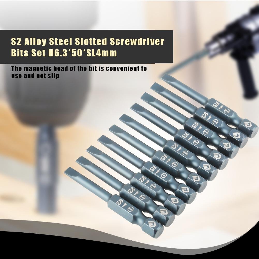 Matériau de haute qualité : ces embouts de tournevis à pointe fendue sont fabriqués en alliage d'acier S2 pour une performance durable dans diverses... 1. Ces embouts sont fabriqués en acier allié , avec grand moment de force et une ténacité élevée. 2. La est traitée par traitement bleu spécial, pas facile à rouiller 3. La tête magnétique du foret est pratique à utiliser et ne glisse pas 4. Avec une tige hexagonale de 6,3 mm (1/4 pouce), ils sont largement utilisés sur les tournevis pneumatiques, les perceuses électriques, etc... Lot De 10 Embouts De Tournevis Plats Magnétiques à Tête Plate De 6,3 Mm Avec Embout hexagonal long au meilleur prix | Leroy Merlin
