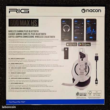 Casque Gaming Sans Fil Nacon Rig 600 MAX Blanc Pour PS5 PS4 Nintendo Switch Nintendo Switch 2 Et Pc Casque PlayStation sans fil RIG 600 Pro HS - Nacon Casque Confort Micro Escamotable Casque RIG 600 Max HS,Officiel PlayStation PS5, Stéréo Sans Fil, Pour Casque Stéréo Double Connexion RF Bluetooth Maîtrisez le son du jeu et le chat sur tous vos appareils de jeu. En sélectionnant le mode Bluetooth, vous choisissez de rester connecté à votre téléphone pour vos appels ou pour écouter de la musique. Test du casque RIG 600 PRO HS : polyvalence et double connectivité pour... La double connectivité sans fil (Dual Wireless) maximise la compatibilité et permet de combiner une connexion radio fréquence 2., 4GHz via un adaptateur USB-C sans fil et une connexion Bluetooth. Une fois camouflé dans l’écouteur, le micro passe en mode muet. Restez connecté 24 heures en Bluetooth sur vos appareils mobiles et jusqu’à 18 heures connecté en USB sur console ou PC. Accédez à une personnalisation approfondie avec l’application 600 MAX Navigator, y compris les réglages personnalisés de l’égaliseur, la sensibilité du microphone, les modes sans fil et bien plus encore.