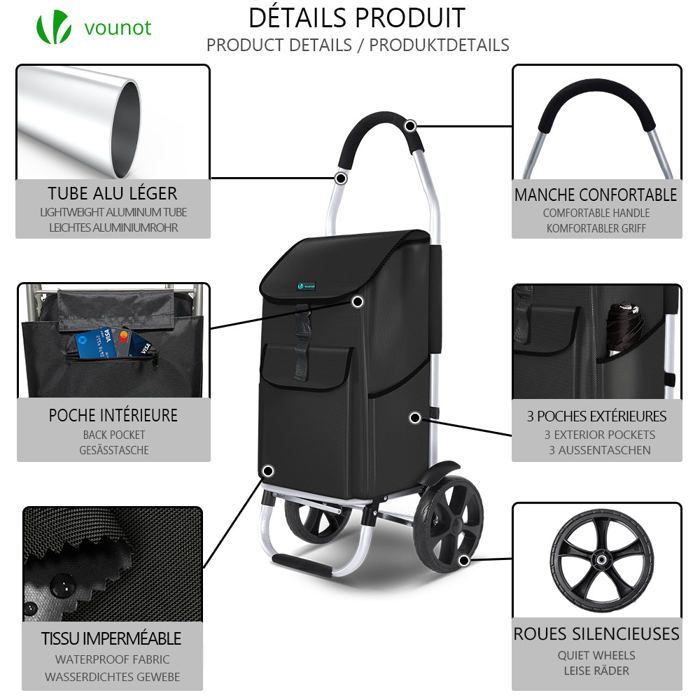 Chariot à Provisions Chariot d'achat Chariot de Courses Pliable avec Sac à Provisions Roulettes Chariot De Courses à Roulettes, Chariot De Courses Pliable, Grande Capacité De 50 L, Chariot à Bagages Multifonctionnel Avec Roulettes, Sac à Dos Amovible étanche Chariot De Provision 6 Roues Article que je recherchais afin d'avoir un outil de transport sous la main en cas de besoin, sans être obligée d'emmener un caddie de courses, pour une charge pas trop lourde Description: faciliter les achats et les courses avec ce chariot de magasinage pliable étanche., ., Équipé de roues lisses et d'une poignée télescopique réglable, il garantit une mobilité sans effort pour transporter des courses ou des forfaits lourds., ., Le tissu imperméable protège vos effets personnels de la pluie et des déversements, gardant tout sec et sécurisé., ., Lorsqu'il n'est pas utilisé, le chariot se replie de manière compacte pour un stockage pratique dans les espaces restreints ou les troncs de véhicule., ., Son intérieur spacieux offre amplement d'espace pour une variété d'articles, de l'épicerie à la lessive., ., Une alternative écologique et réutilisable aux sacs en plastique, ce sac à provisions sur roues combine l'aspect pratique, la durabilité et la commodité pour vos besoins quotidiens., ., Parfait pour les marchés, les centres commerciaux et les voyages., ., Fonctionnalités:., ., Sac de chariot de magasinage., ., -Color: noire., ., -Material: tissu., ., Remarque: Mesure manuelle, veuillez laisser de légères erreurs sur la taille., ., Les couleurs peuvent exister une légère différence en raison de différents écrans., ., Package comprenant 1 x Sac de chariot de shopping Sacs à provisions 2 en 1 pliable, chariot de courses à roulettes, petit sac à provisions en tissu Oxford avec roulettes, sac d'épicerie pour courses : : MaisonTissu Oxford robuste : l'extérieur des sacs fourre-tout pliables est fabriqué en tissu Oxford imperméable et imperméable, plus une connexion de couture dense, vous pouvez utiliser ce sac pendant une longue période Large... Sac écologique réutilisable: Conçu pour remplacer les sacs en plastique à usage unique, ce chariot de magasinage réutilisable soutient une vie tout en manipulant des charges lourdes en toute sécurité. Caractéristique pliable compacte: La conception pliable permet au chariot de s'effondrer dans une petite taille portable, ce qui facilite le stockage dans les placards, les troncs de voiture ou sous les sièges.