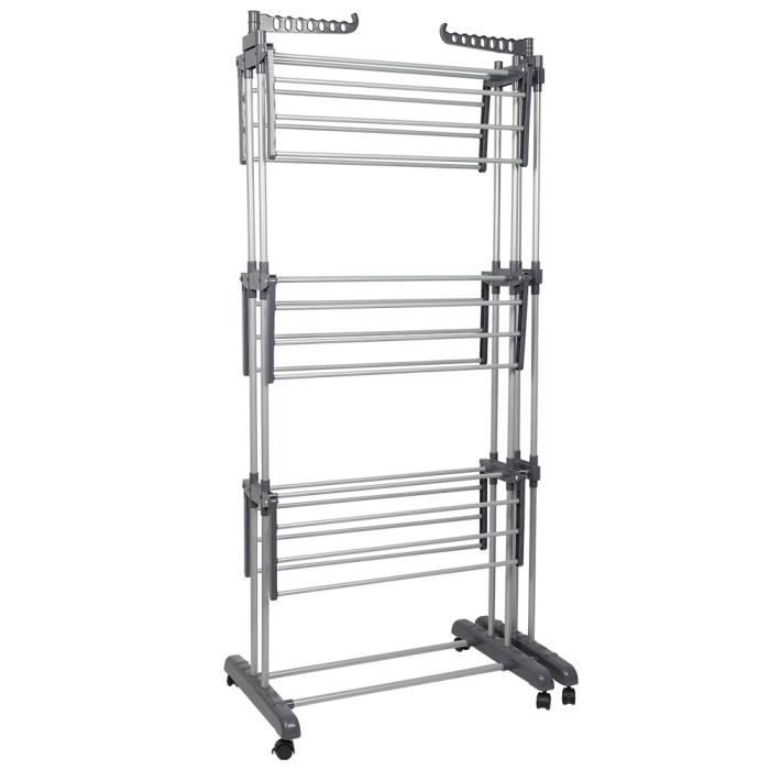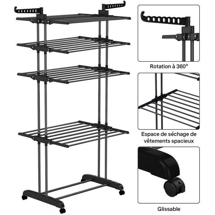 ● Large gamme d'applications : Ce séchoir à linge pliable est conçu avec une conception simple, ce qui lui permet de s'adapter à divers environnements. étendoir à Linge Pliable Taotigzu Étendoir à Linge Pliable,Séchoir à Linge Extensible,2 Grande étendoir Pliable Rangement La structure à plusieurs niveaux optimise l’utilisation de l’espace vertical : chaque étage est judicieusement espacé pour garantir une circulation adéquate de l’air, évitant le surpeuplement et permettant aux vêtements de sécher efficacement. Les eilleurs Étendoirs à Linge XXL ● Conception pliable : Grâce à ses supports de cintres rotatifs à 360° et à ses grilles de séchage pliables, ce séchoir à linge autoportant se plie facilement. Son design pliable facilite son rangement et son encombrement réduit. Innovagoods étendoir à linge vertical métallique pliable et extensible... ● Construction robuste : Fabriqué en tubes métalliques de haute qualité, résistants à l'eau et à la rouille, ce séchoir à linge à 4 niveaux est durable et robuste. ● Espace de séchage suffisant à 4 niveaux : Ce séchoir à linge pliable est doté de 3 grilles de séchage avec 10 barres de suspension par niveau et de 2 supports de cintres avec 7 trous de chaque côté. Vous pouvez ainsi le déplacer facilement à l'endroit souhaité. Homidec Étendoir À Linge Pliable À 4 Niveaux Réglable En Acier Il offre ainsi un grand espace de séchage pour les vêtements. Ce séchoir à linge robuste est idéal pour une utilisation en intérieur et en extérieur.
