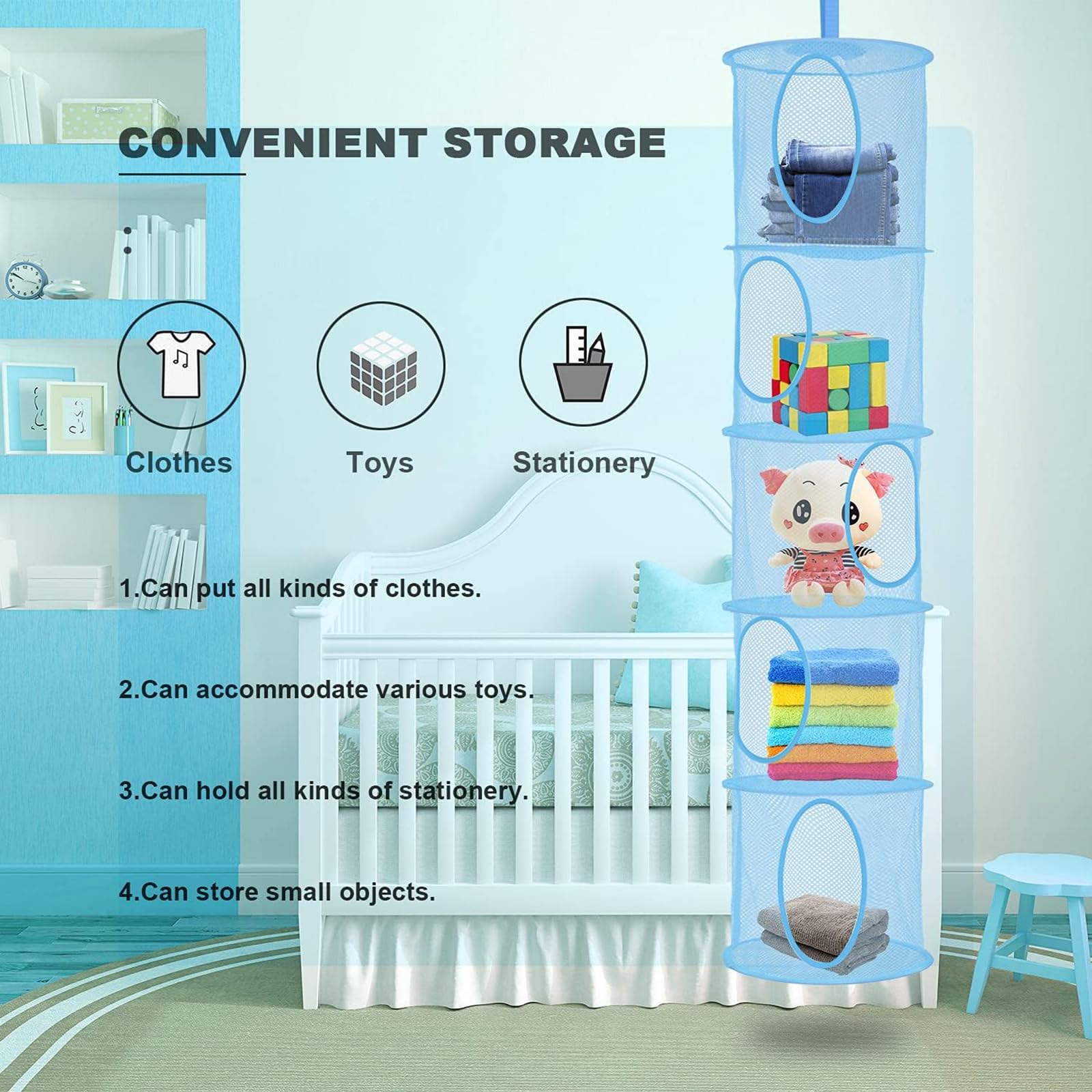 Gain de place : chaque rangement pliable pour jouets en peluche dispose d'une sangle de suspension Velcro robuste intégrée pour une suspension facile et une utilisation maximale de l'espace debout. Design personnalisé : chaque compartiment du rangement de jouets suspendu a une grande ouverture pour faciliter le retrait et la mise en place des articles. Large application : le sac de rangement en maille peut être accroché au mur, à la chambre ou au bureau. Dimensions : 30 x 30 x 138 cm. Filet De Rangement Suspendu Pour Jouets - Sac De Rangement En Filet Suspendu - Organisateur De Rangement En Filet Suspendu Avec 4 Compartiments Panier De Rangement Pliable Économiseur D'Espace Pour Chambre D'Enfants Il peut également être plié lorsqu'il n'est pas utilisé, ce qui le rend facile à transporter Grand espace pour répondre aux besoins quotidiens. 2 Pièces Filet de Rangement Suspendu en Maille 3 Niveaux, Panier de... Il peut non seulement stocker les jouets des enfants, mais peut également être utilisé comme panier de séchage Lot de 2 paniers de rangement pliables en maille à suspendre pour jouets en peluche, 5 niveaux, filet de rangement à suspendre en maille polyester pour jouets, vêtements, articles divers (bleu) Caractéristiques : 1., Le rangement de jouets suspendu est conçu avec 5 compartiments indépendants pour faciliter le tri et le rangement des articles. La couleur bleue classique le rend bien assorti à l'environnement environnant. Panier Rangement Suspendu Maille Lot De 2 Paniers Pliables CAO En Jacinthe D'eau, Boîte De Rangement Coloris Naturel Panier Suspendu Rangement Il peut être utilisé pour ranger les vêtements de tous les jours dans les placards, les salles de bains et les chambres, les paniers de rangement pour les jouets et articles divers pour enfants, les affaires de bébé, et également très approprié pour les dortoirs universitaires et les petits appartements Pour le rangement des animaux en peluche, la décoration de chambre d'enfant, les articles privés, les petits accessoires, etc.
