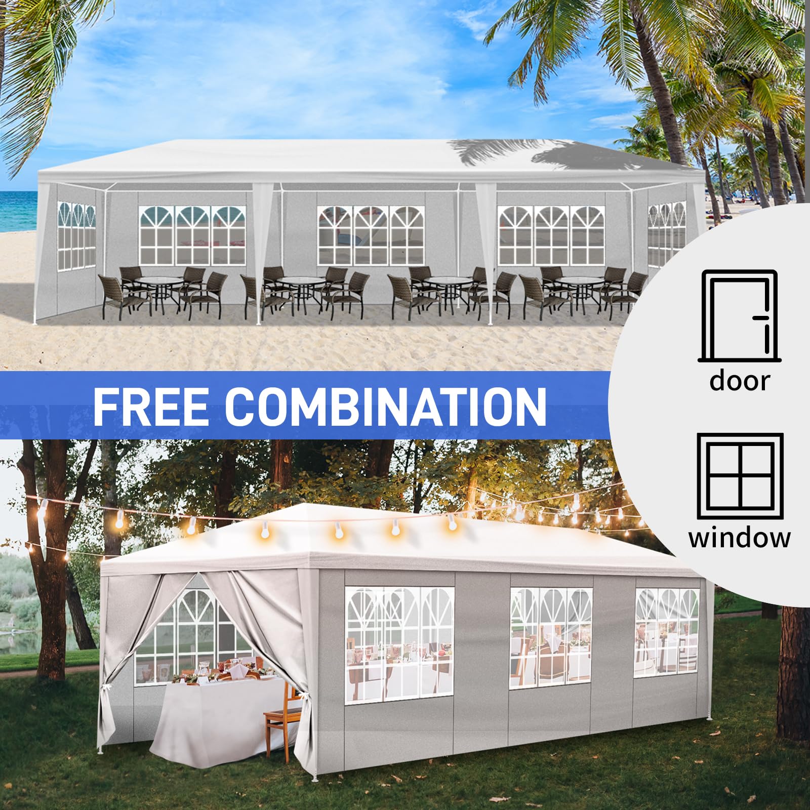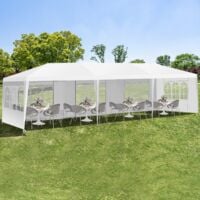 [Montage facile] Notre tente de réception s’installe rapidement et sans effort, vous permettant de vous concentrer sur l’essentiel : organiser et profiter de votre fête ! Tente Réception 8 Parois Fenêtres Bonnlo Tonnelle De Jardin Pliante 3x3 Imperméable Avec 4 Parois Tente Reception 3x6 Présentation : Découvrez notre tente polyvalente 3x9m, votre partenaire idéal pour tous vos événements extérieurs ! Alliant élégance et robustesse, sa construction en toile PE haute densité et sa structure en tubes de fer spiralés garantissent durabilité et stabilité. L'installation simple et rapide, combinée aux accessoires fournis, en fait un choix pratique pour toutes les occasions Ne manquez pas l'opportunité de transformer vos espaces extérieurs - commandez dès maintenant et profitez d'une expérience en plein air sans compromis !, Caractéristiques : 1., Matériau : Tube de fer et toile PE 2., Couleur : Blanc 3., Dimensions : 300 x 900 x 260 cm (L x l x h) 4., Poids : 18,3 kg 5., Imperméable : Oui 6., Structure de la tente : Tente simple 7., Parois : 8 parois (2 rideaux de porte + 6 parois à fenêtres) 8., Convient pour : Ménage, mariage, fête, parking. Grâce à lui, votre événement sera aussi confortable qu’inoubliable. Tonnelle de jardin | Tente de réception escamotable pliable avec 5... L'installation simple et rapide, combinée aux accessoires fournis, en fait un choix pratique pour toutes les occasions. Cette solution tout-en-un s'adapte parfaitement à vos besoins, du mariage intime à la protection de véhicule. [Structure stable] Notre pavillon utilise un système de tubes filetés pour un maintien renforcé. Tonnelle de jardin - XMTECH - 3x9m - Étanche - Autoportante - Pratique Alliant élégance et robustesse, sa construction en toile PE haute densité et sa structure en tubes de fer spiralés garantissent durabilité et stabilité. Notre tente de jardin peut également servir comme stand de vente ou d’information lors de marchés ou festivals.