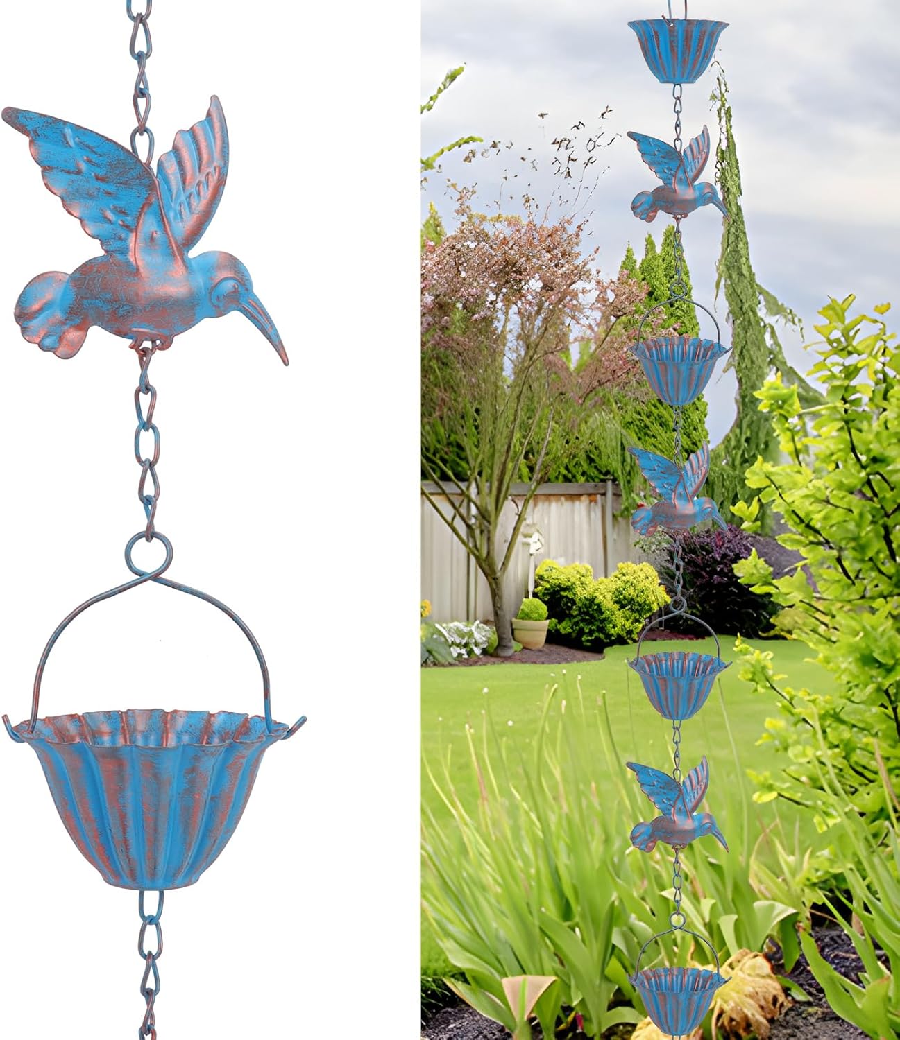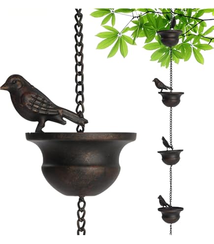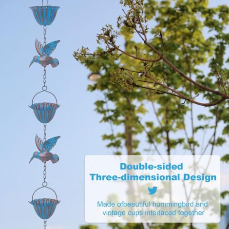 Aifeorzo Chaîne de pluie de 2,5 , chaînes de pluie pour gouttières Taille de la chaîne de pluie : la longueur totale de la chaîne de pluie pour tuyau de descente est de 2,4 m, taille du colibri : 9,9 cm de long x 13 cm de long, taille de la tasse de 8,9 cm de large x 6 cm de profondeur, large en haut et bas étroit, attrape efficacement la majeure partie de la pluie tout en permettant aux éclaboussures d'eau. évacuation Eau Pluie Métal Clyfanesy Chaîne De Pluie 2,4 M Avec Colibris, Chaîne De Pluie En Métal Pour Gouttière, ChaîNe De Pluie Pour ExtéRieur, Chaine Pluie Suspendue Pour L'évacuation L'eau Chaîne Suspendue Anti-rouille 2,4 M Chaîne de pluie en métal : la chaîne de pluie est composée de 7 colibris et de 7 tasses, fabriquées en métal de haute qualité, les colibris et les gobelets sont reliés par une chaîne, et en bas se trouve un oiseau en fonte pour la stabilité. Chaîne de pluie métallique décorative 123 cm avec lotus, colibris et... AINISIS Chaînes de pluie de 3 pour gouttières, gouttières, chaîne... Quand il pleut, s'asseoir à proximité avec une tasse de thé ou de café et d'écouter le beau son de l'eau qui coule est une expérience merveilleuse. Facile à installer : cette chaîne de pluie fonctionnelle et magnifiquement décorative est très facile à installer, aucun outil n'est nécessaire, il suffit d'accrocher le crochet en forme de S directement à l'adaptateur. Cadeau parfait : cette chaîne de pluie rend votre maison unique. Les chaînes de pluie remplacent non seulement les descentes pluviales traditionnelles, mais peuvent également être utilisées pour décorer les porches et les jardins Décorations extérieures : Les chaînes de pluie colibri sont de belles décorations. Quand il pleut, c'est un moment merveilleux de s'asseoir près de la maison avec une tasse de thé ou de café et d'écouter le doux murmure de l'eau qui coule