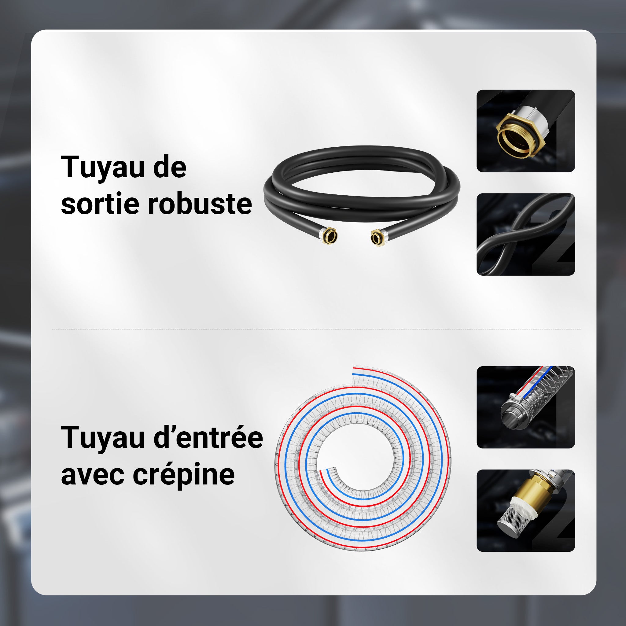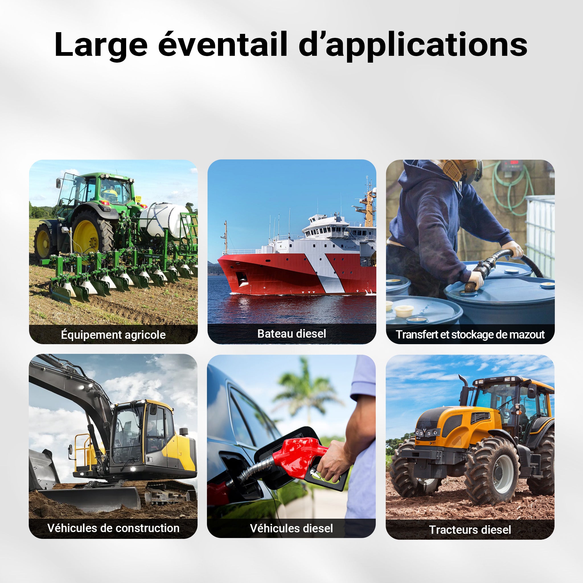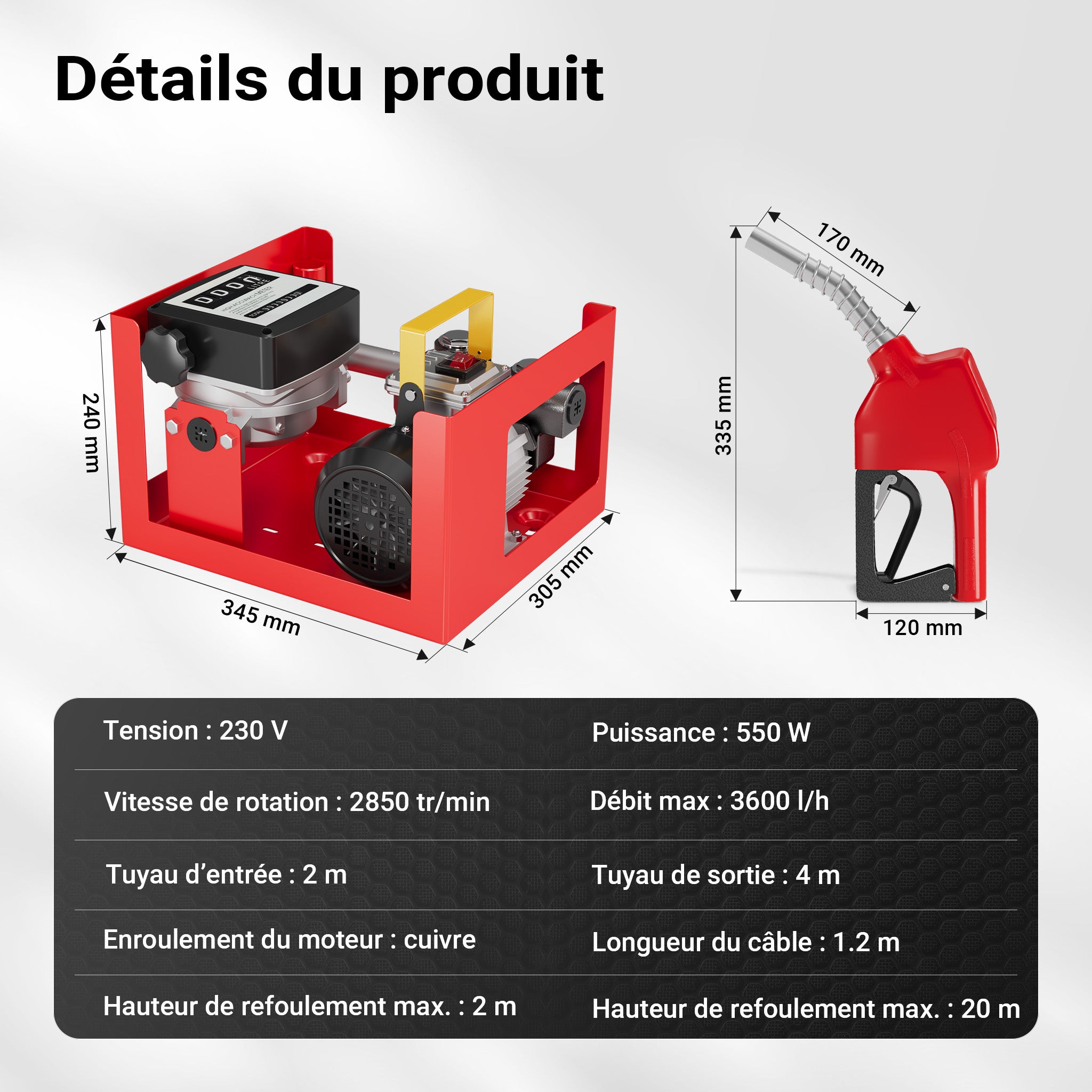 1 tuyau de sortie d'huile., 1 pistolet à huile. Tous les accessoires de montage., Remarques : 1., Veuillez lire attentivement le manuel et suivre strictement les précautions pour une meilleure expérience. Il dispose également d'une fonction d'affichage intuitive qui peut afficher avec précision la quantité de carburant pompée par fonctionnement. Une telle efficacité élevée peut vous aider à accomplir rapidement la tâche de pompage ou de livraison de diesel. Tranquillité assurée : le filtre nettoie efficacement le diesel pour éviter les blocages et le clapet anti-retour empêche le risque de reflux. Le boîtier en fonte d'aluminium et le support en tôle d'acier assurent une forte ténacité et résistance et fonctionnent bien pendant une longue période. Dimensions du débitmètre (L x l x h) : 14 x 14 x 8,5 cm., Poids brut : 17,8 kg., Poids net : 16,9 kg. Traitement de surface : galvanoplastie, oxydation Couleur : rouge, noir., Modèle : piston. Compteur mécanique diesel ou fuel Raccords 1 Débit 19 – 75 l/min... La vitesse du pistolet à huile peut être réglée librement, et la plaque dentée interne peut également vous aider à maintenir trois vitesses différentes, à économiser du temps et de l'énergie. Avant d'utiliser ce produit, veuillez vous assurer que les câbles d'alimentation et tous les autres appareils sont en bon état de fonctionnement et ne pas fumer ou utiliser ce produit dans des zones proches de flammes nues., 3., Veillez à ne pas déplacer ce produit ou à retirer le boîtier pendant le fonctionnement. Cette pompe de transfert diesel est une solution multifonctionnelle pour pomper efficacement le diesel pour les véhicules, les chantiers, les exploitations agricoles et autres équipements extérieurs alimentés par le carburant. Wiltec Pompe à Fuel Gasoil bio Autoaspirante – 230 V / 550 W Dimensions du produit : 30,5 x 20,5 x 34 cm. Longueur du tuyau d'entrée : 2,06 m. Longueur du câble d'alimentation : 1,36 m. Mesure précise : un système de comptage précis à quatre chiffres avec structure de transmission mécanique peut garantir une précision de mesure allant jusqu'à ± 1 %. Contenu de la livraison : 1 pompe de transfert diesel. EINFEBEN Pompe à diesel Pompe à gasoil Pompe à fioul Pompe pour vidange... Pompe Pour Tracteur Machine Agricole Pompe Gasoil 12 V Pompe à Fioul Pompe à Gazole Auto-amorçante 175 W 50 L/min, Pompe à Gasoil Pompe Avec Tuyaux Inclus Dimensions du colis : 35 x 33 x 38,5 cm. Les tuyaux d'entrée en PVC ont des propriétés antistatiques, de résistance à la dureté et de l'épaisseur de paroi. Débit maximal de la pompe : 60 l/min.