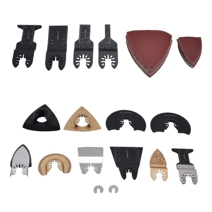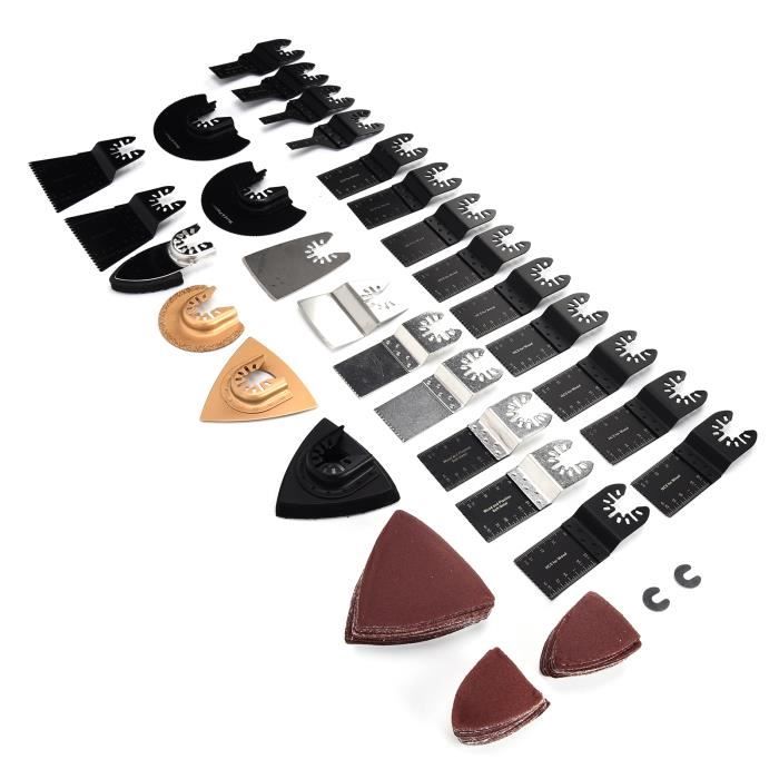 LEF Kit de lames de scie oscillantes, Outils oscillants en acier Adapté au polissage du bois, du plâtre et d'autres surfaces, kit apporte de l'efficacité au processus de ponçage. Accessoires Ponçage Bois Plâtre Sollbry Patins De Ponçage Triangulaires 80 Mm - Patin De Ponçage Kit Patins Ponçage Oscillant kit fournit 150 morceaux de papier de verre avec différents niveaux de grain allant de 60 à 240 pour une utilisation polyvalente sur divers matériaux. Les patins de ponçage à doigts, composés d'oxyde d'aluminium et de matériau PU, un système de fixation arrière à crochets et boucles, améliorant la facilité d'utilisation Kit de 156 patins de ponçage oscillants, 3 patins de ponçage triangulaires et 3 patins de ponçage pour doigts, 150 papiers de verre, pour le ponçage du bois/du... Le grand lot de 150 papiers abrasifs de haute qualité est disponible en différents grains, parfaits pour les processus de ponçage du bois. coussinets double face, à crochets et à boucles, mesurent 80 mm x 80 mm x 80 mm, offrant une large couverture de pour des performances améliorées. Le pack se compose de grains 60/80 pour le bois brut, 100/120 pour les menuiseries générales et 240 pour les finitions finales sur le bois et le plâtre, entre autres surfaces, une finition lisse. Ensemble de 156 pièces de patins de ponçage pour outils oscillants comprenant 3 patins de ponçage triangulaires et 3 patins de ponçage à doigts. Les patins de ponçage à doigts, composés d'oxyde d'aluminium et de matériau PU, un système de fixation à crochets et boucles, améliorant la facilité d'utilisation. Couleur: Couleur de la photoMatériau: métal + papier de verreContenu du colis:3 x patins de ponçage triangulaires3 x patins de ponçage à doigts75 x papiers de verre triangulaires (15 pièces chacun de grain 60/80/100/120/240)75 x papiers de verre à doigts (15 pièces chacun de grain 60/80/100/120/240)Seul le paquet ci-dessus, les autres produits ne sont pas inclus.
