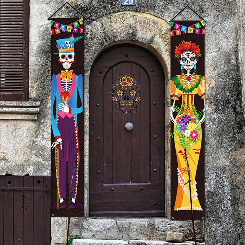 Dia de los muertos, la fête des morts mexicaine, vacances, festival. Vector affiche, bannière et carte avec composition de crâne en sucre, la femme et l'homme Image Vectorielle Stock - Alamy Matériaux durables et fiables : fabriquées à partir de polyester, nos bannières de porche dia de los muertos sont conçues pour durer ; elles offrent un design robuste, doux, infroissable et réutilisable ; avec des impressions vibrantes et résistantes à la décoloration, elles serviront de toile de fond fiable et belle pour vos fêtes... Décoration Mexicaine Dia De Muertos Panneau De Porche Du Jour Des Morts Mexicain, Décoration De Porte Et Décoration Halloween Mexicaine Extérieure En raison des mesures manuelles, veuillez prévoir une légère différence de taille. Cette bannière mexicaine du Jour des Morts crée non seulement une atmosphère effrayante, mais est également idéale pour les célébrations en plein air, les séances photo les décors de scène. Célébration de dia de los muertos. Fête traditionnelle du jour des... Facile à accrocher : les décorations Dia de los muertos ont 4 œillets métalliques, il vous suffit de passer corde à travers les 4 trous de suspension de l'accrocher directement là où vous souhaitez fixer, ce qui vous fait gagner un temps précieux, convient aussi bien à l'intérieur qu'à l'extérieur. Décorations du Jour des Morts : vous recevrez 1 bannière de couverture de porte Dia de los Muertos 2 bannières de porche du Jour des Morts, suffisamment pour vos besoins de décoration de photo du Jour des Morts. Accrochez- à votre porte pour une touche d'éclat à votre fête du Jour des Morts. Design éclatant : bannière Dia de los Muertos est ornée d'un crâne en sucre d'autres éléments du Jour des Morts mexicain.