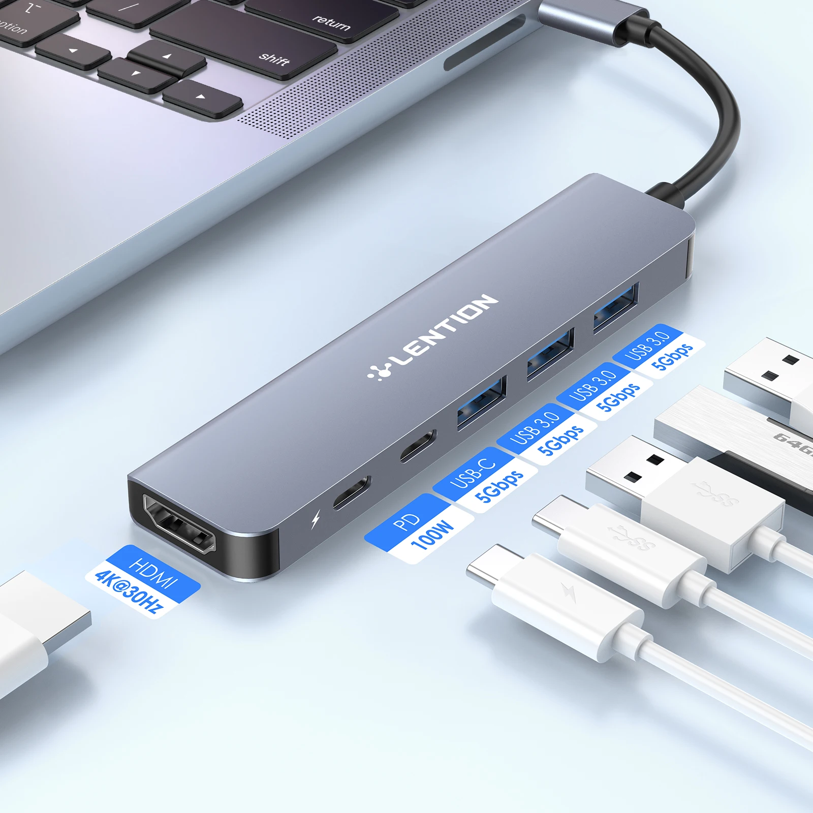 Adaptateur Usb C Vers Usb LENTION Hub USB C, Adaptateur USB C Avec HDMI 4K60Hz, Port De Données De Type C, PD 100W, Lecteur De Cartes SD/TF, USB 3.0, Pour MacBook Pro/Air Lecteur Cartes Sd Tf 6 En 1 Hub Usb C Pour Imac 24 Inch 2021 Avec Hdmi 4K, 10Gbps Usb C Et Haute Vitesse Ultra : Grâce au lecteur de cartes SD/Micro SD dual et de l¿USB 3.0, sa vitesse de transfert de données pouvant atteindre UHS-I (104MB/s... Haute Vitesse Ultra : Grâce au lecteur de cartes SD/Micro SD dual et de l’USB 3., 0, sa vitesse de transfert de données pouvant atteindre UHS-I (104MB/s) - beaucoup plus rapide que la plupart des lecteurs de cartes dans le marché (Remarque : lire une carte à la fois). En plus, le port HDMI 4K à 30Hz et trois ports USB 3., 0 permettent d’avoir une vitesse pouvant atteindre 5 Gbps. Il supporte le signal 3840x2160 4K@30Hz, 2560x1600 et la résolution inférieures à 60Hz. hero-video Vidéo de marchand Brancher & Jouer : Ne nécessite ni pilote externe ni l’alimentation, est supposé à utiliser avec des périphériques portables tels qu'un clavier filaire, une clé USB, un disque externe de 2,5 mm, etc., (Remarque: 1., Fonction de charge n'est pas prise en charge., 2., Pas disponible pour Superdrive) Compatibilité Vaste : Pour MacBook Pro 2016-2024, Nouveau MacBook Air - (Pas pour MacBook Air & Pro de génération précédente), MacBook 12, iPhone 16/iPhone 16 Plus/iPhone 16 Pro/iPhone 16 Pro Max/iPhone 15 Série, Nouveau iMac/Pro, Surface Book 2/Go, Chromebook, aussi que les autres appareils au type C. La protection d’EMI empêche les interférences entre les appareils sans fil. Compatibilité universelle : fonctionne largement avec MacBook Pro 2016-2024 et MacBook Air 2018-2025 (y compris les versions M1, M2, M3, M4...