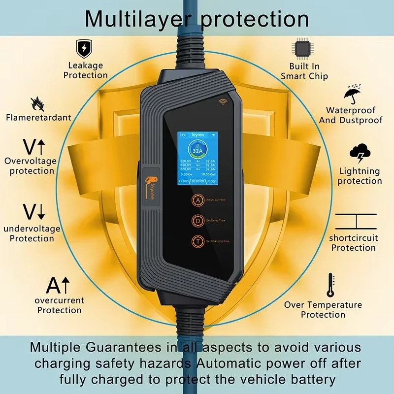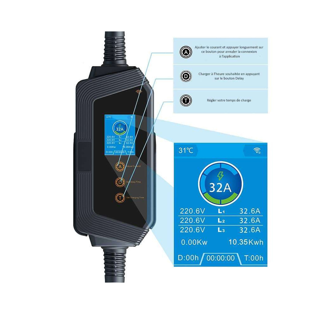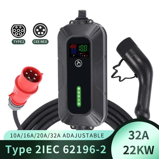 Chargement plus intelligent, contrôle simplifié, repérez instantanément les problèmes et optimisez les performances ! Chargeur Triphasé 380V Réglable 8-32A Chargeur EV Portable 22KW Type 2 Vers Prise CEE Triphasée Câble Type 2 Prise CEE Matériau Durable Premium : Le chargeur EV est construit à partir de matériaux supérieurs et durables, garantissant une excellente qualité et longévité. Pourquoi attendre ? Chargez plus intelligemment ! Vos règles, votre rythme - sans avoir à toucher à chaque fois, définissez l'ampérage parfait pour le câblage de votre garage. Il est équipé de nombreuses fonctionnalités de sécurité, y compris la protection contre les surintensités, les surtensions, les sous-tensions, les fuites et la surchauffe. Chargeur portable voiture électriques réglable - type 2 - prise CEE (Remarque : Le temps de charge réel d'une voiture électrique dépend des deux éléments suivants : la source d'alimentation et la capacité du chargeur embarqué du véhicule. Achetez en toute confiance : Le chargeur EV de type 2 est conforme aux normes IEC 62196 et EN, avec un niveau d'étanchéité (IP66), une classification de résistance au feu UL94 V-0, et utilise le matériau nylon PA66, un câble TPU de haute qualité, sans halogène, en matériau recyclable, résistant à l'usure et à la flexion. Écran OLED : le chargeur de voiture électrique dispose d'un écran pour surveiller en temps réel l'état de charge. Des ampères plus bas pour la sécurité, augmentez-les pour la rapidité. Support 24/7 et garantie premium d'1 an : Nous vous offrons une garantie premium d'1 an, un support technique à vie et un service client. Avec une puissance maximale de 22kW (32A triphasé), rechargez jusqu’à 6 fois plus vite qu’un chargeur standard. Son câble 5m résistant aux intempéries (IP65) et sa prise CEE 32A rouge offrent une flexibilité totale Chargeur lithium TP4056, Type C, micro/mini USB, courant réglable... Les voyants LED du boîtier de contrôle vous aident à identifier l'état de fonctionnement du chargeur EV et les informations de charge pertinentes. Fil TPU : résistant à l'usureÉcran OLED : Résistant aux basses températures, Étanche, Résistant à la neige, Résistant à la poussière, Résistant à la chaleur, etc. Il a été testé pour 10 000 connexions de prise, a une capacité de charge de 2 tonnes, évitant efficacement les risques de sécurité. Le Wi-Fi Smart APation dispose d'un écran LCD qui affiche l'état de charge en temps réel, comme l'état de l'alimentation, le courant de charge, etc.