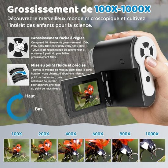 Son coloris noir résistant à la saleté (facile à nettoyer avec un chiffon humide) évite les traces visibles, offrant une longue durée de vie d’utilisation pour les familles. Outil Exploration Microscopique Microscope Numérique Portable - HURRISE - Écran 7 Pouces Microscope Portable 1000x écran 2 1 Microscope&Télescope 2 Photos&Vidéos 3 LED Réglable, 1 Multifonction 2 Multi-scènes Microscope numérique 1000X pour enfants, écran 2.0, rechargeable, portable, avec kit de lames, cadeau éducatif scientifique, couleur blanche Connexion PC+Batterie 1000mAh à charge rapide 15W: Ce microscope enfant portable supporte la connexion à des ordinateurs (Windows et MacOS), permettant de projeter les images microscopiques sur un écran plus grand - idéal pour des activités d’apprentissage en groupe (chez soi ou à l’école) ou pour exporter des travaux scientifiques. Sa batterie rechargeable de 1000mAh avec charge rapide 15W garantit jusqu’à 4 heures d’utilisation continue après chargement complet. Noté /5. Achetez Microscope Portable USCAMLE 1000X pour Enfants - Mini Microscope Numérique de Poche pour Adultes avec Lames Spécimens pour Apprentissage Scientifique, Cadeau Éducatif Rechargeable, Enfants 8-12 Ans sur Livraison gratuite possible dès 25 La réglage précis évite les images floues dues à la lumière insuffisante ou excessive, garantissant une observation claire et détaillée pour les enfants. 1000X Grossissement à 10 niveaux: Le microscope numérique enfant portable dispose d’un ajustement de zoom à 10 niveaux (100-1000X), adapté à l’observation de divers échantillons - des cellules de feuilles aux textures de minéraux, des pattes d’insectes aux grains de pollen. La carcasse noire étant résistante à l’usure et à la saleté, il est adapté à une utilisation fréquente en école ou en extérieur. USCAMEL Microscope Numérique Enfants Portable Une expérience d’observation interactive et immersive, tout en un ! Design compact et portable: Poids seulement 160g et dimensions de 9., 3×5., 5×10., 8cm, ce mini microscope se glisse facilement dans la poche d’un cartable, un sac à dos ou une poche de pantalon - parfait pour des explorations en plein air (parcs, campagnes, excursions).
