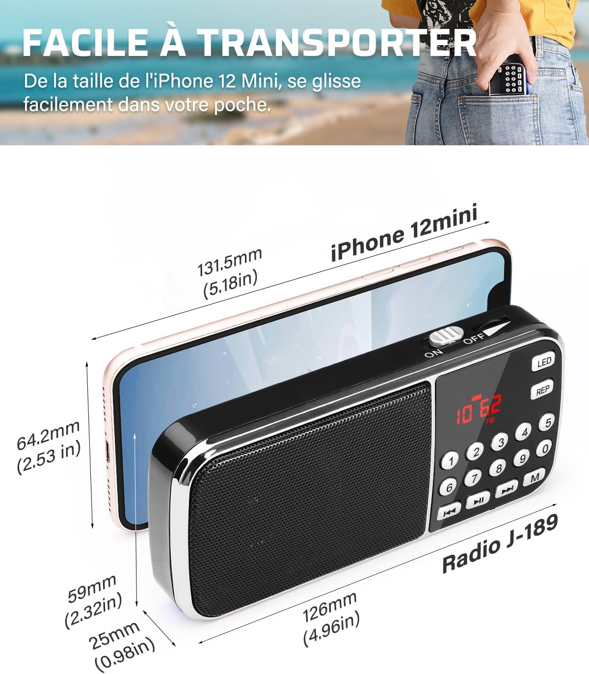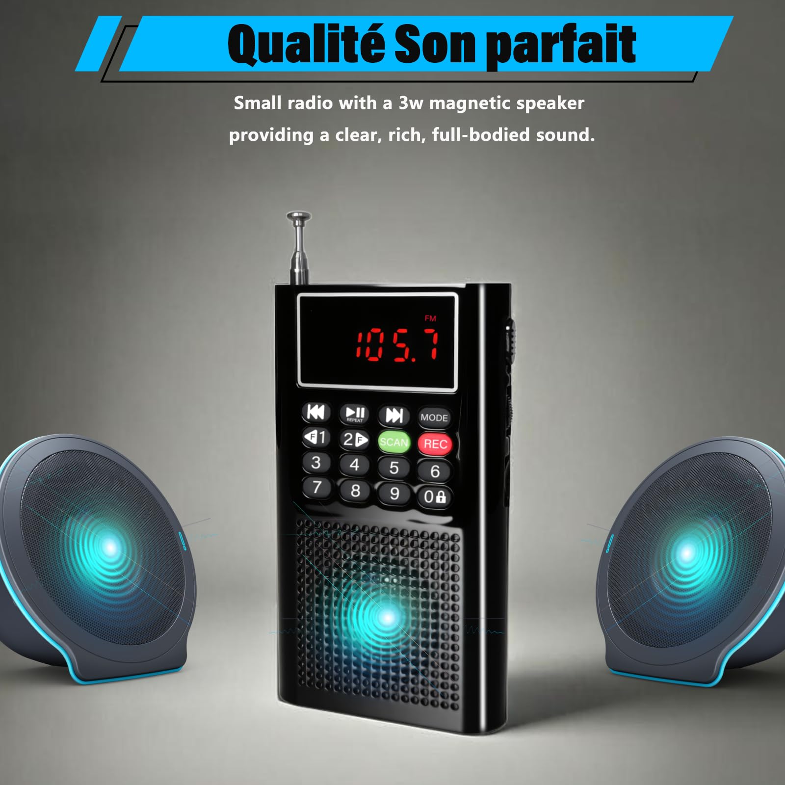 Compact et intuitif, cet appareil allie technologie audio fiable et simplicité d’utilisation, parfait pour un usage quotidien ou professionnel. 【Design Portable & Pratique】Ce radio portable rechargeable de style lecteur portable, mini et ultra-léger, se transporte facilement en voyage, déplacements ou aventures en plein air (randonnée, camping). 【Radio FM Puissante avec Numérisation Automatique】Profitez d’une écoute fluide grâce à la fonction de radio portable intégrée qui scanne automatiquement les fréquences, verrouillant rapidement vos stations préférées (actualités, musique, sports). Ce poste radio combine aussi un lecteur MP3 polyvalent, compatible avec les clés USB et cartes TF pour diffuser vos fichiers audio. Batterie Intégrée écoute Nomade Poste Radio Portable, Mini Radio FM Avec Balayage Automatique Radio Camping Voyage Passez sans effort des émissions de radio a pile à votre bibliothèque musicale personnelle. Rechargez-le facilement via un câble USB, idéal pour un usage domestique ou nomade. Que vous maîtrisiez les technologies ou préfériez un radio portable rechargeable sans complications, cet appareil garantit une prise en main immédiate. 【Scénarios d’Utilisation Polyvalents】Ce poste radio portable excelle dans divers contextes: maison, bureau, voyages ou activités extérieures. Poste Radio Réveil FM Bleu Enceinte Bluetooth MP3 - August SE20 Son format compact résistant s’adapte aux sacs et poches, tandis que le verrouillage des touches évite les manipulations accidentelles, préservant vos réglages. Idéal pour les amateurs de musique et d’émissions en déplacement, il allie portabilité et fonctionnalités essentielles. Son design pratique et ses performances polyvalentes répondent à toutes les envies, que ce soit en intérieur ou en exploration en plein air. Cet outil est idéal pour les étudiants souhaitant archiver des cours ou pour les amateurs de contenu poste radio mémorable. Radio-Casque Portable,Mini Radio Numérique Tuning Fm Radio Walkman Avec... Poste Radio Portable, Mini Radio FM avec Balayage Automatique, Batterie Rechargeable Intégrée, Lecture MP3 Via USB/Carte MicroSD ; i. Livré entre le 16/01 et le... Grâce à ce mini radio portable robuste, profitez d’un divertissement nomade sans compromis. Ce mini radio polyvalent prend en charge les clés USB et cartes TF pour lire vos fichiers MP3, tout en offrant une radio fm portable pour explorer de multiples stations (musique, actualités, podcasts). 【Options Audio Polyvalentes】Branchez vos écouteurs via la prise jack pour une écoute privée, ou utilisez la sortie AUX pour relier des enceintes externes et amplifier l’expérience sonore. 【Fonction Enregistrement Pratique】Ne ratez plus jamais une émission radio rechargeable importante grâce à l’enregistreur intégré. La numérisation automatique des canaux simplifie la recherche de stations, tandis que l’affichage clair indique les réglages et la fréquence en cours. Qu’il s’agisse d’écouter la poste de radio fm lors de vos trajets quotidiens ou de profiter de vos fichiers MP3 en randonnée prolongée, l’autonomie fiable de ce radio portables garantit un divertissement ininterrompu tout au long de la journée.