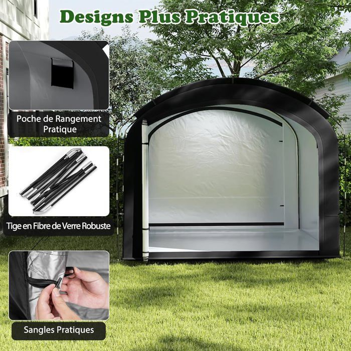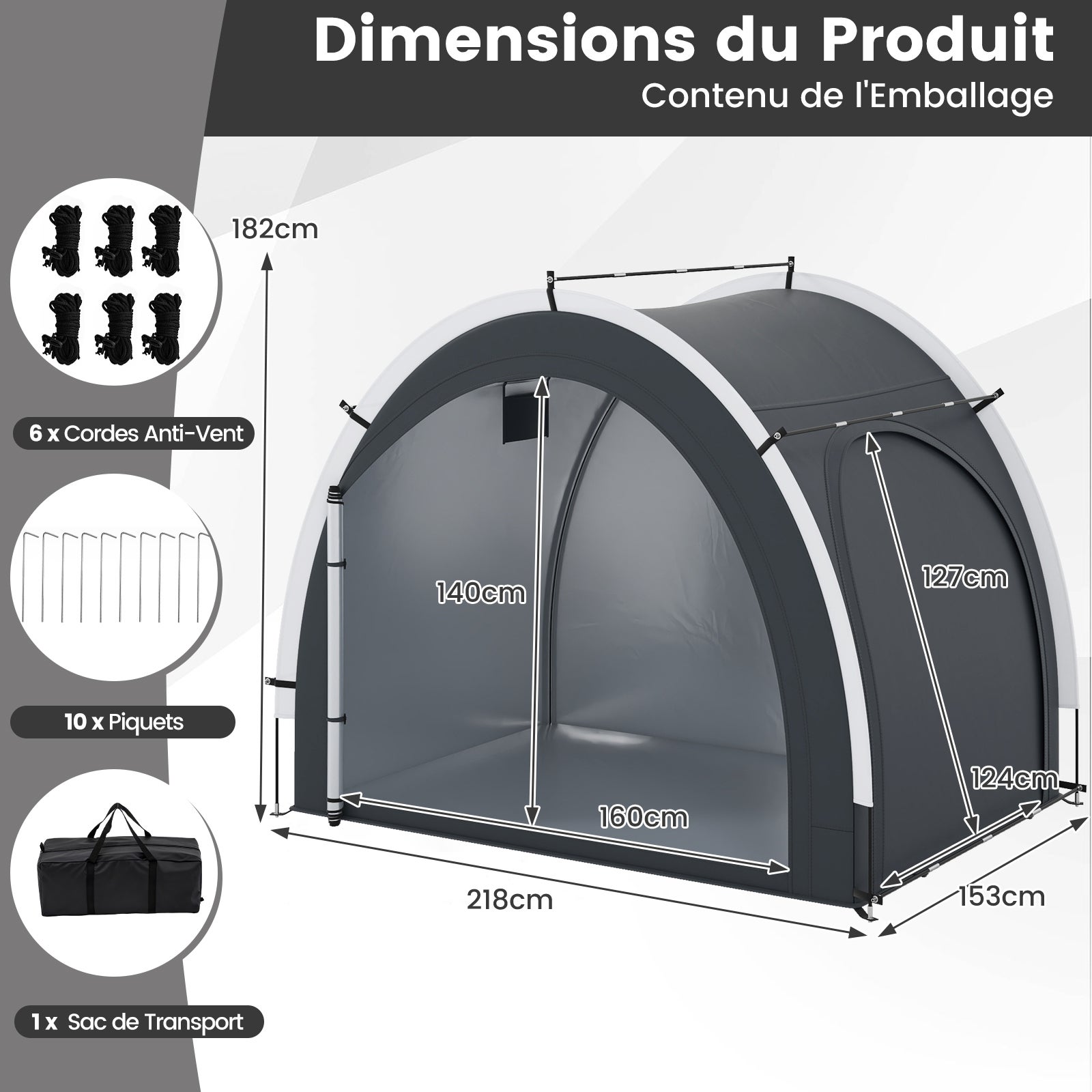 Costway abri de vélos extérieur de 160 x 218 x 164 cm, abri de garage portable pour vélos avec Ce tissu de tente premium offre une excellente protection et garantit que vos vélos restent propres et secs. Structure Fibre De Verre Portable Abri De Rangement Pour Vélos, Tente De Jardin Portable Pour 4 5 Velos Avec Tissu Impermeable Sac De Transport Abri Exterieur Pour Outils Jouets Motos 98169100 Abri Jardin Outils Jouets 【Matériau de qualité】Cette tente de rangement pour vélos est fabriquée en tissu Oxford sélectionné avec un revêtement argenté imperméable à l'intérieur, réputé pour sa résistance à la déchirure, son imperméabilité et sa protection solaire. L'abri de stockage extérieur peut être utilisé comme abri à vélos, local à bois de chauffage, remise à outils de jardin. Le cadre est constitué de tuyaux en acier galvanisé robustes, qui ne rouillent pas facilement Avec des dimensions de 218 x 153 x 182 cm, elle peut accueillir 4 à 5 vélos ainsi que plusieurs outils et jouets. La porte frontale zippée et l'entrée latérale... 【Structure anti-vent】 La structure robuste est soutenue par des tiges en fibre de verre solides et renforcée par des piquets au sol et des cordes anti-vent. 【Grande capacité & usage polyvalent】 Avec des dimensions de 218 x 153 x 182 cm, cet abri à vélo offre un espace de stockage généreux, pouvant accueillir facilement 4 à 5 vélos. Ce cadre stable garantit que votre tente de stockage reste bien fixée quelles que soient les conditions météorologiques, offrant une protection fiable à vos objets précieux. Avec des dimensions de 218 x 153 x 182 cm, elle peut accueillir 4 à 5 vélos ainsi que plusieurs outils et jouets. Il peut également contenir des outils de réparation, des jouets d'extérieur, des tondeuses à gazon, des accessoires de piscine, et plus encore. Description : Vous cherchez une solution de rangement fiable pour vos vélos et équipements extérieurs ? Notre tente de rangement pour vélos est fabriquée en tissu Oxford avec un revêtement argenté imperméable et protecteur contre le soleil.