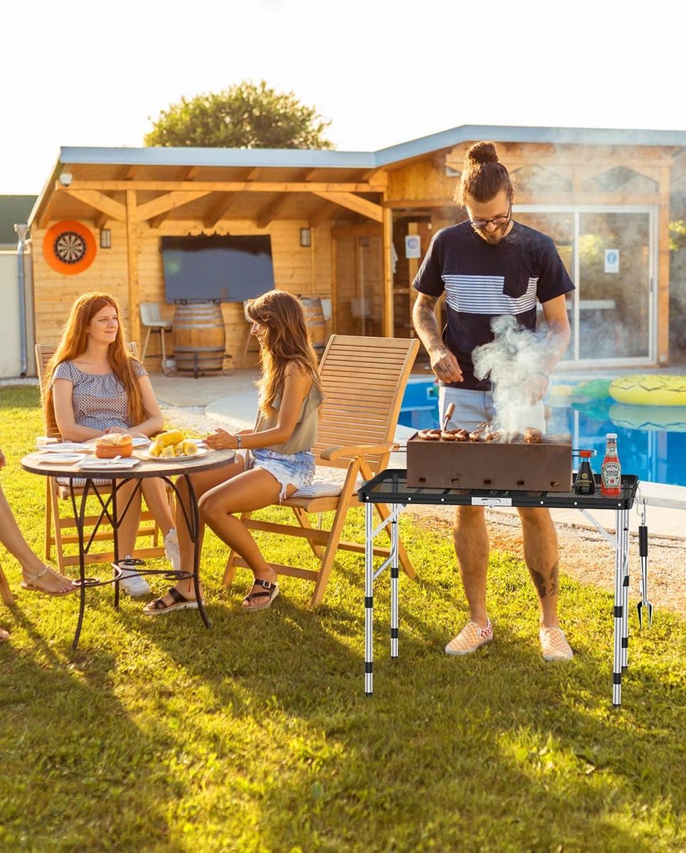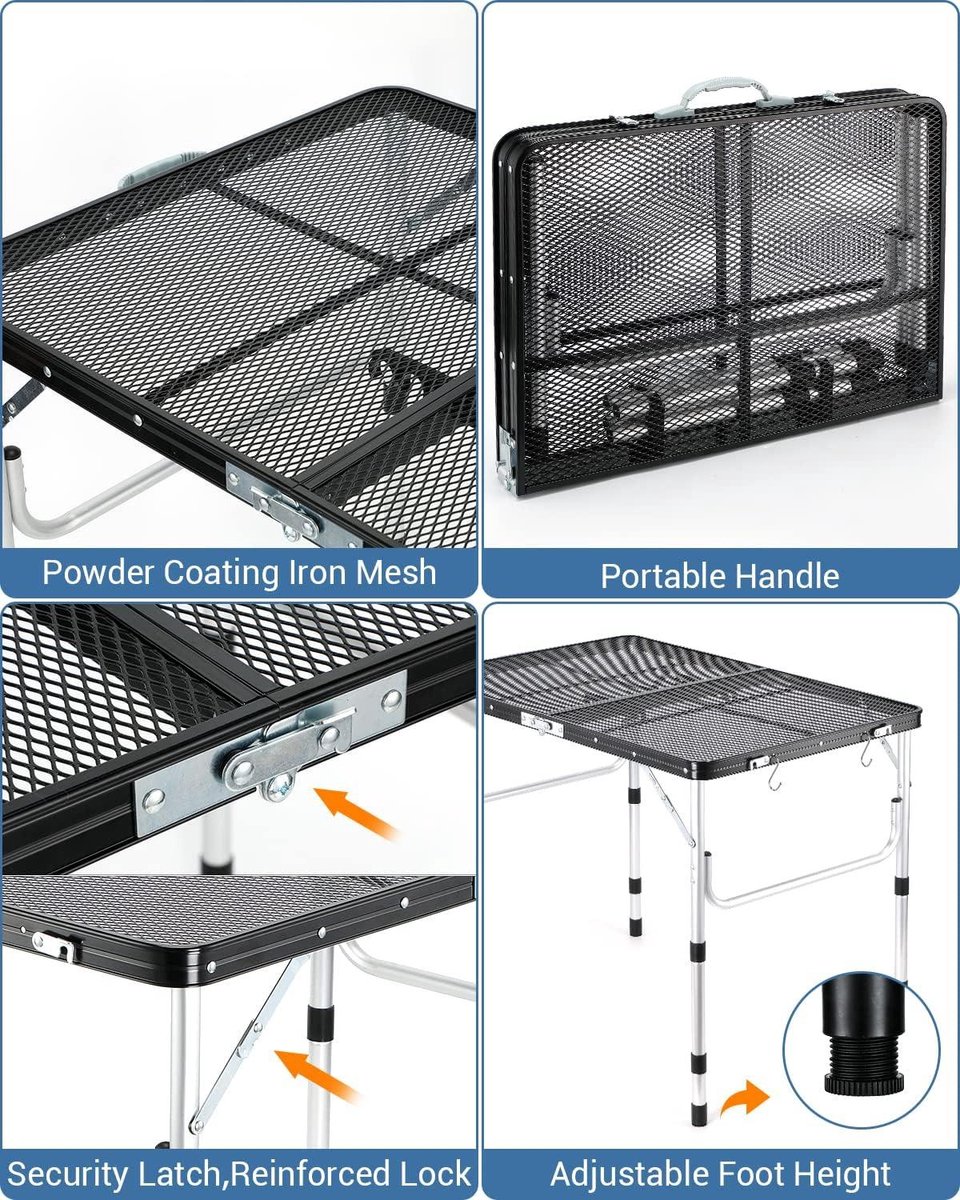 Table Camping Pliante Table Pique-nique Portable Table De Camping Pliable DeeprBling - Hauteur Réglable 27/56cm - 60x40cm - 2,2kg Table Barbecue Pliable Avec Filet Table Exterieur Table de BBQ d'extérieur 90 cm x 60 cm - réglable en hauteur - aluminium - portable Modonghua Grille de pique-nique pour barbecue - Largeur réglable... Poids du produit : 3,5 kg., Charge maximale : 120 kg [léger et portable] cette table de camping pliante est très légère et peut être pliée dans le style d'une mallette, la taille pliante est d'environ 63*7., 5*48., 5cm, ce qui la rend très portable et ne se produira pas du voyage au coffre de la voiture. [2 hauteur réglable] table de camping pliante exposition jusqu'à 90 * 60 * 65cm, très spacieuse. Spécifications: Plateau de table : acier Pieds : fer Dimensions plié : 63 x 7,5 x 48,5 cm Format déplié : 90 x 60 x 65 cm. Ces deux hauteurs sont de 40 cm chacune. 65cm, assis ou debout, choisissez la bonne hauteur selon vos besoins, idéal pour des activités telles que les repas, les pique - niques, etc. Si vous placez de petits grils extérieurs, la conception de la grille dissipe la chaleur plus rapidement et est plus facile à nettoyer. Hauteur réglable : 67 cm - Hauteur basse : 37 cm - Dimensions déplié : 90 x 60 x 67/37 cm - Dimensions plié : 60 x 45 x 6,5 cm. · Construction robuste