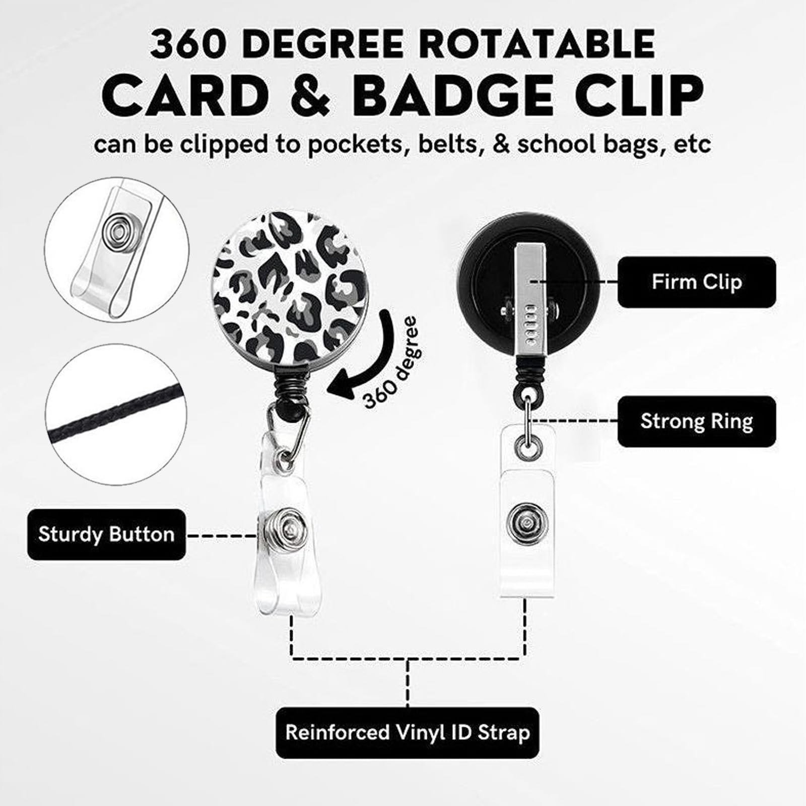 Porte Badge Enrouleur HTTDSLF Porte Badge De Carte D'Identification, Porte Badge Accessoire Badge Travail Avec étui Léopard Porte-Badge Avec Cordon Rétractable Et Réglable En Forme De Léopard La sangle est douce sur la peau, rétractable jusqu'à 40 cm et la pochette transparente protège bien ta carte ou ton badge. Le système rotatif à 360° te permet... Équipé d'un cordon extensible de 50 cm avec mousqueton de haute qualité, ce porte-badge permet un accès facile et rapide à votre carte ou badge. Le mécanisme fluide évite les emmêlements et s'adapte à toutes les morphologies. Conçu pour un usage intensif, ce porte-badge convient aux infirmiers, agents de sécurité, étudiants ou événements. Description du produit Porte Badge, Porte Badge Tour De Cou, Tour De Cou Badge, Porte Badge Infirmiere, Porte Carte Tour De Cou, Porte-Badge, Tour De Cou Porte Badge, Cordon Badge Tour De Cou, Cordon Badge, Porte Carte Cou, Porte Carte Avec Cordon, Porte-Badge Tour De Cou, Porte Carte Badge, Collier Badge, Porte Carte Collier, Porte Carte Infirmiere Spécification Quantité: 2 Idéal pour les infirmières, les employés de bureau ou tout utilisateur needing un accessoire pratique et tendance. Sa conception ultra-mince et légère le rend facile à glisser dans une poche ou à porter autour du cou. Compatible avec la plupart des formats de cartes standard., 4., Polyvalence et Confort d'Utilisation: Conçu pour un usage intensif, ce porte-badge convient aux infirmiers, agents de sécurité, étudiants ou événements. Le cordon ajustable et la pince robuste garantissent un port confortable toute la journée., 5., Kit Professionnel et Pratique: Le matériau durable résiste à l'usure quotidienne, tandis que la fermeture sécurisée empêche la chute du badge. L'enrouleur rétractable s'étend jusqu'à 61 cm, idéal pour pointer rapidement. La dragonne est amovible. Avec son mousqueton, tu peux l'accrocher à ta poche ou...