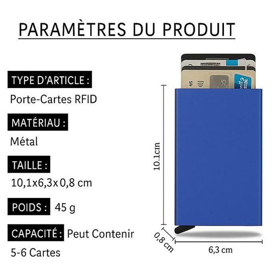 Portefeuille Compact Sécurité Porte-cartes Crédit Cuir Buffle XXL - Protection RFID NFC - 24 Emplacements - Marron étui Cartes Crédit Xxl Il est parfait pour ceux qui détestent les portefeuilles traditionnels encombrants et qui ont peu d'espace dans leurs poches. Porte-cartes De Crédit Femme Porte Carte Porte-Cartes RFID En Aluminium Anshuke - 6 Emplacements - Protection Contre Le Vol De Données étui Slim Portable Porte-cartes Métal Rfid 【Dimensions du produit】 Ce porte-cartes est léger et résistant. Sa particularité : il intègre une couche de blindage en aluminium qui bloque les ondes radio, empêchant la lecture frauduleuse des puces RFID/NFC sans votre... Porte-cartes de crédit RFID en métal pour hommes et femmes, boîte à 6 fentes, anti-vol, anti-démagnétisation, mini robe, étui à cartes ; Lieu d'origineChine... Sa surface lisse et ses bords sont soigneusement polis pour protéger vos vêtements et vos sacs. 【Blocage RFID】: Dans un magasin, un aéroport ou une rue bondée, les voleurs peuvent utiliser les lecteurs RFID pour scanner discrètement les informations de votre carte. Le cadenas en métal massif garantit une fermeture sûre et fiable. Redéfinissez vos besoins quotidiens et simplifiez-vous la vie. Cependant, ce porte-cartes offre une barrière de sécurité qui empêche la détection des signaux de la puce RFID, garantissant ainsi la sécurité de vos cartes. Vous pouvez les ouvrir d'une seule main pour accéder rapidement et facilement à vos cartes.