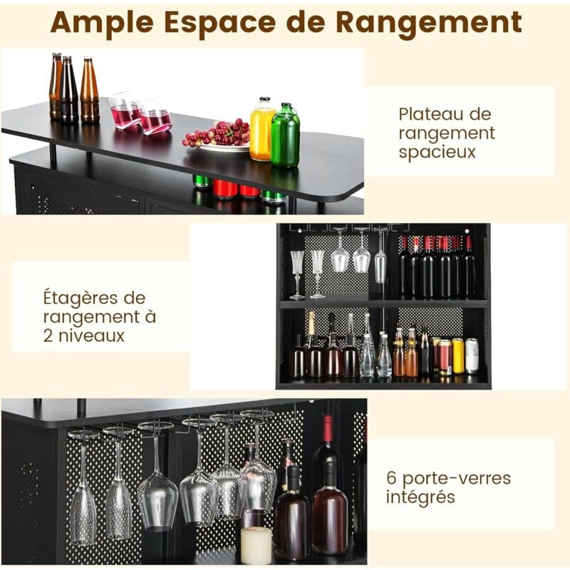 Facile à assembler et avec une garantie de satisfaction, cette table de bar est parfaite pour les réunions entre amis ou pour ajouter une touche de style à votre maison ou votre entreprise. Giantex Meuble de Bar à Vin, Buffet Industriel avec Porte-Bouteilles et En outre, il y a des garde-corps de protection sur le côté de chaque étagère pour éviter que vos affaires ne tombent. Table Bar 4 Niveaux Porte-bouteilles KOFOTTEU Porte-bouteilles De Vin Avec Roues, Globe Bar, Porte Ilot Cuisine Ses 3 étagères ouvertes, son porte-bouteilles pour 5 bouteilles et ses porte-gobelets garantissent un rangement organisé, tandis que le repose-pieds en métal offre un confort supplémentaire. Ne manquez pas l'occasion de profiter de ce meuble unique et fonctionnel ! Trent Austin Design Table-bar moderne avec porte-bouteilles, porte... PLUS DE DÉTAILS : Les instructions détaillées et les accessoires numérotés vous facilitent l'installation de la barre, en outre, la conception des pieds surélevés peut également vous faciliter le nettoyage du sol sous la barre. VARIÉTÉ D’ESPACE : En plus d'un plan de travail généreux pour prendre des verres, discuter et s'amuser, cette table de bar dispose de 3 étagères ouvertes, d'un casier pour 5 bouteilles de vin et de 4 rangées de porte-gobelets, offrant beaucoup d'espace à vos affaires et les garder plus organisées. Facile à assembler et avec une garantie de satisfaction, cette table de bar est parfaite pour les réunions entre amis ou pour ajouter une touche de style à votre maison ou votre entreprise Repose-pieds en métal pour un repos plus confortable. Porte-bouteilles pour 5 bouteilles de vin, tout en les gardant accessibles. REPOSE-PIED PRATIQUES : La table à vin de salle à manger dispose d'un repose-pieds en métal de 114 x 24 cm à la base de la partie arrière, sur lequel vous pouvez placer vos pieds pour un repos relaxant plus confortable, avec coussinets réglables pour plus de stabilité. Description du produit Bienvenue à KOMFOTTEU : Plongez dans le charme vintage de cette table de bar industrielle au design moderne et fonctionnel. ASPECT VINTAGE : L'aspect vintage de style industriel permet à la table haute d'ajouter une atmosphère élégante à votre maison, que ce soit dans la cuisine, la salle à manger, le salon ou n'importe où, cette table mange-debout peut être un ajustement parfait, vous offrant un endroit pour vous détendre et vous reposer.