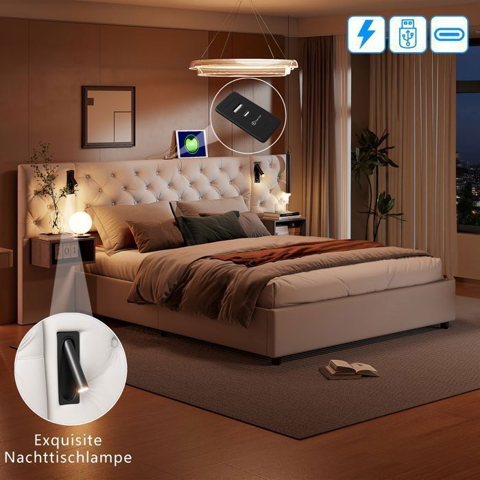Les ports USB et Type-C intégrés permettent de charger vos appareils directement depuis le lit, alliant ainsi confort et praticité pour un usage quotidien simplifié. Le sommier à lattes en bois, densément espacées et équipé de bandes anti-bruit, garantit un soutien optimal et un sommeil paisible. 【Livraison sécurisée et montage simplifié】Livré en 2 colis soigneusement emballés pour minimiser les risques de dommages, ce lit 140x200 est facile à assembler grâce à son manuel clair et précis. Elle comprend un espace pour poser votre téléphone, vos livres ou vos lunettes. Lit 160x200 Avec Sommier LED Et USB, Lit Coffre 140x200 Avec Rangement Et Tete De Lit Noir La tête de lit s'ouvre pour révéler un compartiment secret, idéal pour vos objets du quotidien. Un véritable ajout de style et de technologie pour transformer votre chambre en un espace moderne et vibrant. Lit Coffre 160x200 avec LED et USB,Lit Double Rembourré avec Rangement et Tete de lit,lit2 Personnes Cadre de Lits avec Sommier à Lattes,Cuir PU,Noir(sans... En cas de pièce manquante ou endommagée, notre service client réactif est à votre disposition pour une solution rapide et efficace. 【Éclairage LED RGB personnalisé】Le lit 160x200 cm est équipé d’une bande LED RGB élégante intégrée à la tête de lit et sous le cadre. Un lit conçu pour allier durabilité et confort absolu. Lit Moderne Avec Rangements Et éclairage Lit Double Avec Ports USB Lit Coffre 160x200 Evaolph Avec LED Et Rangement - Sommier Lattes - Prises USB/Type-C - Noir Lit 200x200 Sommier Lattes Bois Lit Coffre Style moderne en velours : design capitonné chic et élégant, parfait pour une chambre contemporaine. Tête de lit pratique : ports usb éclairage led intégrés pour un confort optimal jour et nuit. Double espace de rangement : tiroir et coffre hydraulique pour garder votre chambre bien organisée Aucun outil spécial n'est requis.