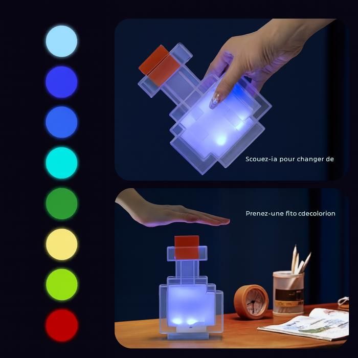 – un véritable accroche-regard pour les occasions spéciales. mourir Ernest Shackleton Prévu veilleuse de projection volatilité Tromperie enth Le temps de recharge est d'environ 1 heure, la durée d'utilisation peut atteindre 6 heures. Décoration LED Rechargeable Jeu Une Bouteille De Potion Magique Avec Une étiquette Lumineuse Qui Dit Magique 899870 6613 Bouteille Lumineuse LED 🎁Légère et portable, elle convient à de nombreuses occasions, idéale comme décoration et comme cadeau pour les enfants, les amis, etc. Spécifications : Taille : 26*16*8 CM Couleur : 8 couleurs Matériau : ABS Contenu du paquet : 1 x bouteille de potion magique lumineuse 1 x câble de chargement Éclairez votre chambre avec cette lampe de table de 7 pouces, ofant 8 couleurs LED rechargeables et inspirées de la magie de la lampe minecraft... 【Cadeau idéal】 Cette lampe magique en forme de bouteille de potion est un ajout unique à la collection de tout fan. Elle se nettoie facilement à l'aide d'un chiffon. Ajoute une touche magique à ta chambre avec cette adorable veilleuse en forme de potion Minecraft ! 💖 Inspirée de l’univers pixelisé du célèbre jeu, cette petite lampe change de couleur rien qu’en la secouant En la secouant légèrement, vous pouvez changer la couleur à votre guise. 【8 couleurs différentes】 La bouteille magique de potion lumineuse brille de huit couleurs différentes : bleu, bleu clair, vert, jaune, orange, rouge et blanc. 【Lampe rechargeable par USB】 La veilleuse LED est livrée avec un câble de recharge USB. Udbrud Potion magique bouteille lumineuse avec 8 couleurs qui changent lorsque vous la secouez pour les enfants 🌟Cette petite bouteille de potion magique lumineuse avec huit couleurs différentes brille d'une seule couleur jusqu'à ce que vous la secouiez pour la changer. La lampe en forme de bouteille de potion magique s'allume en appuyant sur l'interrupteur situé en dessous.