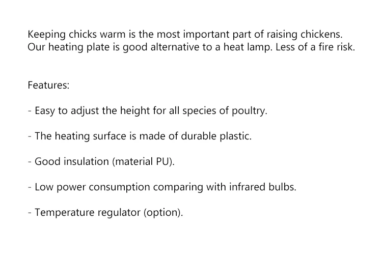 【Installation facile et gain de place】 : il est livré avec une poignée, facile à déplacer, offrant une flexibilité sans précédent. Technologie de chauffage améliorée : il dispose d'une puce de contrôle de thermostat intelligente et d'un capteur de température pour une conductivité supérieure pour un transfert de chaleur rapide et efficace. Chauffage Poulailler 160W Acier Inox Chauffage Thermostatique Pour Poulailler – 200 W – Température Réglable Radiant Chauffant La plaque rayonnante de 160W diffuse une chaleur douce et uniforme jusqu'à 40cm. Réglage de température de 50°C à 75°C. L'autocollant thermosensible indique... 【Chauffage efficace】 : le chauffage pour poulets de 160 W pour poulailler, incubateur et couveuse pour animaux de compagnie fournit une zone de chauffage radiante efficace dans les 390 x 290 mm, la chaleur émise par le chauffage est uniformément répartie, assurant une chaleur optimale pour les animaux. Il résiste à l’usure, ce qui le rend adapté à une utilisation à long terme dans des environnements exigeants. Caractéristiques: Nom: Chauffage Coop Matériel: acier inoxydable Puissance : 160W Contrôle de la température : 0-99 ℃ Longueur du cordon : 1,65 m Zone de chaleur radiante efficace : 390 * 290 mm / 15,35 * 11,42 pouces Taille du paquet: 400 * 300 * 55 mm / 15,75 * 11,81 * 2,17 pouces Poids du colis : 1 200 g / 2,65 lbListe de colisage: 1 * chauffage de coopérative En le montant sur le support, le radiateur peut fournir efficacement de la chaleur sans occuper un espace précieux dans le poulailler, la niche ou tout autre enclos pour animaux. Il peut fournir une chaleur essentielle pendant les saisons les plus froides, assurant confort et bien-être, améliorant la production d'œufs, prévenant les engelures, etc. Il dispose d'une puce de contrôle de thermostat intelligente et d'un capteur de température pour une conductivité supérieure pour un transfert de chaleur rapide et efficace. L'arrière du radiateur comporte des trous pour le montage mural. et offre un environnement confortable et chaleureux pour les poules, chatons, chiots et autres animaux en hiver froid. Câble chauffant pour abreuvoirs de poulailler (24 V 10 W Cela permet aux utilisateurs de réguler facilement la puissance calorifique en fonction des besoins spécifiques des animaux hébergés. Il est conçu avec des trous de montage qui peuvent être montés là où il doit être fixé. Il fournit une zone de chauffage radiante efficace dans un rayon de 0,39*0,29 m, la chaleur émise par le radiateur est uniformément répartie, assurant une chaleur optimale pour les animaux. VGEBY Chauffage de poulailler Chauffage Numérique LCD pour Poulailler, 300 W 220 V, Thermostat
