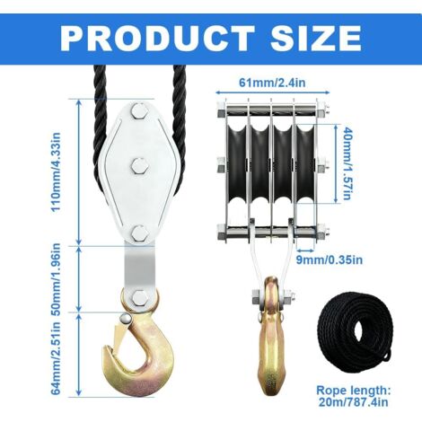 Poulie Pour Levage Hissage Poulie à Corde Cordes, Ratchet Robuste Réglable Avec Crochet En Corde En Acier Inoxydable Pour Lampes Suspendues A Led Lampes De Croissance Tableaux Daffichage 92257885 Poulie Angle Corde Travail Poulie Double avec bloqueur Twin Release de PETZL - Sécurité Landry Corde Polypropylène avec crochet 50 mètres - Diamètre 22 mm Efficace et économique d'espace: un outil pratique pour les électriciens, les ingénieurs et les installateurs, avec une conception pliable pour le stockage et le transport sans effort, la commodité des voyages Corde à poulie polypropylène avec crochet - diamètre 20 mm CORDERIE... Pratique et fonctionnel: évite les dommages aux murs et aux planchers en réduisant la friction, la poulie de corde d'angle est parfaite pour le placement aux bords de la porte, les coins et les seuils de fenêtre Support de corde adaptable: avec une large rainure intérieure, il fonctionne de manière transparente avec divers câbles, des cordes métalliques, des cordes en nylon et des ceintures de levage, réduisant l'effort et améliorant la commodité des utilisateurs Performances durables et lisses: conçues pour une fonctionnalité transparente, la poulie n'a pas de fouilles, prend en charge efficacement les charges , résiste à la déformation et offre une grande durabilité avec ses propriétés résistantes à l'usure Spécification:S Poids: 1400gM poids: 1500gL Poids: 1600gTaille du produit: comme indiquéMatériau: métal + nylonListe de colisage:1 * poulie2 * Crochets1 * cordeNotes: 1., En raison des effets d'éclairage et des angles de photographie, il y a une différence de couleur dans le produit, veuillez comprendre., 2., En raison de la mesure manuelle, il y a une tolérance dans la taille du produit.