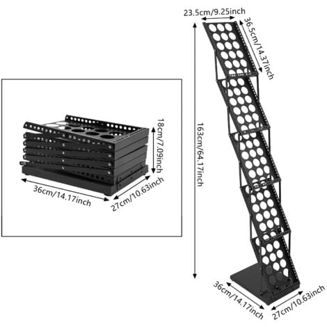 Présentoir Facile à Ranger Présentoir Pliable Pour Brochures, Porte-revues, étagère à 4 Présentoir Pour Salle D'attente QWORK® Porte-brochure A4, Présentoir à brochures, pliable, noir Présentoir à prospectus pliable à 4 niveaux - Support pour catalogue... Utilisation Ce produit peut être utilisé pour ranger divers magazines, brochures, prospectus, etc. Il convient pour divers affichages d'informations dans les bureaux, les bibliothèques, les salles d'attente, les écoles, les attractions touristiques, les foires commerciales, les centres de soins de santé et d'autres lieux. Caractéristiques Matériau : Fer Procédé : poinçonnage de précision, pulvérisation électrostatique : Poinçonnage de précision, pulvérisation électrostatique Assemblage requis : Non Nombre de niveaux : 4 Type d'étagère : Étagère à étages Type de montage : Montage au sol Charge maximale d'un étage : Environ 5kg/11., 02lbs Taille du panneau creux (L*l) : 36., 5*23., 5cm/ 14., 37*9., 25in Poids brut : 4,5kg/ 9., 92 lbs Poids net : 4kg/ 8., 82 lbs Taille de l'emballage : 40*18*29 cm/ 15., 75*7., 09*11., 42in Taille du produit : 36*27*132 cm/ 14., 17*10., 63*51., 97in Taille pliée : 36*27*13cm/14., 17*10., 63*5., 12in 📦Le paquet comprend 1 * Porte-revues pliable Description Notre porte-revues pliable est incliné, ce qui permet aux clients de sélectionner et de tenir les magazines plus facilement. 【Matériau de haute qualité】:Ce produit est fabriqué en fer de haute qualité et a été soumis à un processus de poinçonnage de précision et de pulvérisation électrostatique. 【Bonne ventilation】:Le panneau creux peut ventiler efficacement et prévenir la moisissure, de sorte que les documents et les magazines stockés restent toujours secs. Le panneau avec extension est efficace pour empêcher les livres de tomber. Présentoir de brochures H1450xl270xP360mm aluminium argent pliable 6...