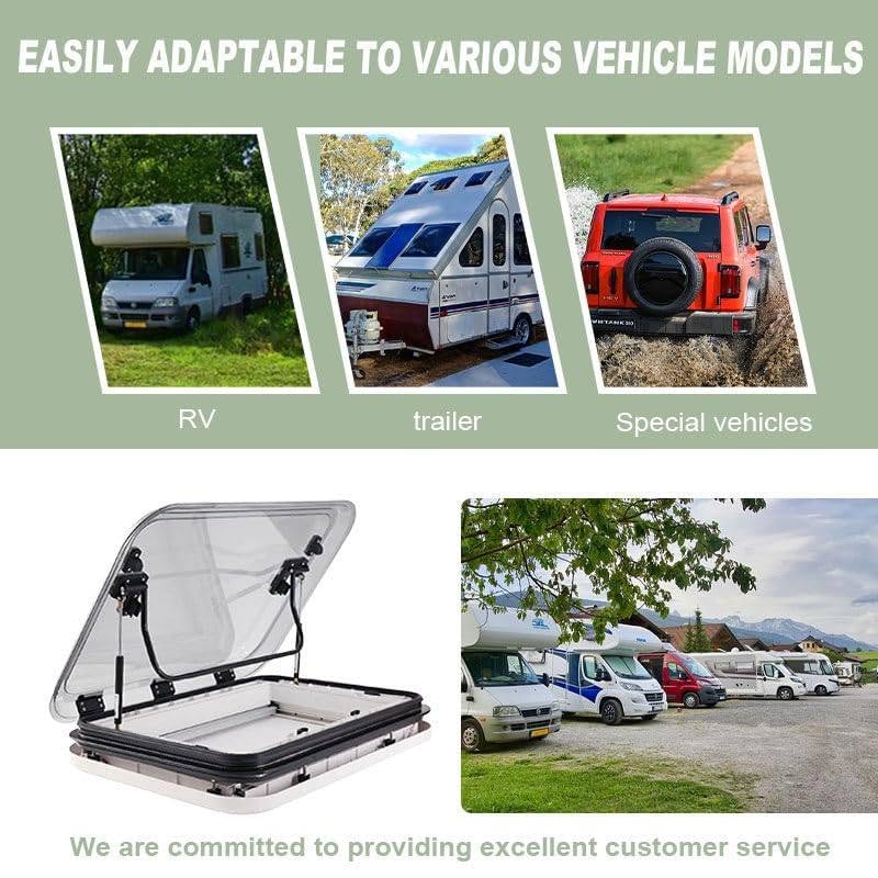 Toit Ouvrant Voiture Universel Fenêtre De Toit Pour Camping-Car, Koubhyj Lanterneau Pour Lanterneau Camping Car 700x500 Grand lanterneau DOMETIC Heki 2 de Luxe - Lanterneau pour caravane La fenêtre de toit pour camping-car est une ouverture au-dessus de la cabine de conduite, permettant de favoriser la ventilation naturelle et d’apporter un éclairage naturel dans l’espace habitable Convient principalement aux caravanes, camping-cars, remorques, véhicules modifiés, véhicules spéciaux. 【PARAMÈTRES PRINCIPAUX】Type : puits de lumière ; Matériau : cadre supérieur en alliage d'aluminium de haute qualité, cadre intérieur en ABS et couvercle en acrylique double couche. Angle d'ouverture : 70 degrés ; Installation : par serrage ; Cadre intérieur : blanc ; Verre : gris transparent ; Moustiquaire : blanche ; Pare-soleil : blanc ; Puits de lumière standard adapté aux épaisseurs de paroi : 25 mm-60 mm (0,98 ''-2,36 ''). 【FENÊTRE INTÉGRÉE MULTIFONCTION】cette fenêtre pour camping-car est dotée d'un cadre monobloc sans soudure, étanche aux fuites et aux intempéries. 【REMARQUE】Veuillez noter que les dimensions indiquées pour la commande correspondent aux dimensions de découpe et non aux dimensions hors tout. Épaisseur de paroi applicable aux puits de lumière pour camping-cars : 25-60 mm (0,98-2,36 ''). Qu'il s'agisse de camping en camping-car, de transport de marchandises longue distance ou de voyages autonomes, il peut assurer une bonne circulation de l'air dans la voiture pour assurer le confort et la sécurité du conducteur et des passagers tout au long du voyage. Lanterneau 40x40 cm QUIPON Sky - Ouverture toit pour van, fourgon...