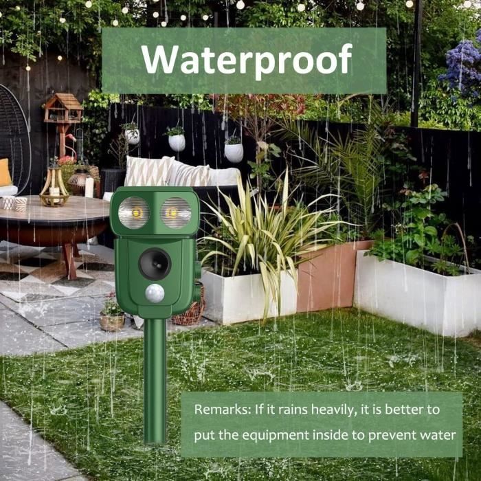 Répulsif pour animaux. Le design humanisé n'endommagera pas vos chats, chiens ou autres animaux domestiques. 1,13,5 kHz -19,5 kHz, haut-parleurs à ultrasons fonctionnels, repoussent les animaux tels que les rats, les chiens, les renards, les furets, etc. Cadran de fréquence (0-5) En tournant le bouton dans le sens des aiguilles d'une montre vous pouvez régler une fréquence différente de 1 à 5 canaux., 0., Éteint. La zone effective couvre un arc de 120 degrés et une distance allant jusqu'à 30 pieds (10 m). Capteur infrarouge : le nez du répulsif pour hiboux est un capteur infrarouge (PIR), capable de détecter les animaux de toutes tailles. 2023 2x Répulsif Pour Chats Repulsif Taupe Répulsifs Pour Chat à énergie Solaire à Ultrasons IP66 étanche Avec Fréquence Réglable Ultrasons Chien Rat Oiseau Notre top 10 des Répulsif Ultrason Chat au France - Mai 2025 Protection à ultrasons : les répulsif pour chien émettent uniquement des ondes ultrasoniques de 13,5 kHz à 45,5 kHz, ce qui est sans danger pour le corps humain et sans danger pour le corps humain. Tournez le bouton dans le sens des aiguilles d'une montre pour augmenter le rayon de protection. Laissez le hibou absorber l'énergie quand il y a le soleil. Fdit Répulsif pour animaux solaire Répulsif antiparasitaire imperméable... Inclinez ou relâchez La mise à la terre sous la pluie peut causer des dommages à l'équipement., 4., Si le réveil sonne gênant, vous pouvez le désactiver ou baisser le volume pour éviter d'affecter la vie de la personne ou du voisin., 5., Lorsque certaines fonctions (comme les ultrasons, le flash ou l'alarme acoustique) échouent après un certain temps, la batterie peut être déchargée. Remarque : s'il y a des orages ou si c'est un mauvais temps, il est recommandé de l'emporter à l'intérieur. ☀【Charge USB et énergie solaire】 Il y a un panneau solaire sur la tête du hibou. Ce répulsif pour chats utilise des ultrasons pour éloigner les animaux indésirables sans leur causer de dommages. Il fonctionne à l'énergie solaire et est conçu... IP66 étanche et facile à installer : ce répulsif pour chat est étanche IP56., Il est capable de résister à la pluie normale. Peut être installé n'importe où dans la maison, le jardin ou le patio, les jardins, les patios, les allées de route, les champs, les pelouses, les bords, les garages, les fermes et toutes les 2,19,5 kHz-28,5 kHz, haut-parleurs à ultrasons fonctionnels, repoussent les animaux comme les chats, ratons laveurs, blaireaux, puzzles, etc., 3., L'alarme vocale fonctionne, simulant le son d'animaux qui ont peur de chasser les animaux, comme les oiseaux, les chats, les chiens, etc., 4., Forte LED clignote, peut conduire des ratons laveurs, oiseaux, sangliers, grilles, etc., 5., En travaillant de manière circulaire, de 1 à 5 canaux, repousser tous les animaux avec voix à fréquence variable et fort clignotement de la LED., Proposition : 1., Utilisez le câble USB pour charger la batterie pour la première fois., 2., Les exclusions de rang n'auront pas d'effet immédiat et peuvent prendre 10 à 15 jours Afin d'exercer tout l'effet dissuasif, il est recommandé de le remplacer régulièrement., 3., Le niveau de protection IP56 de l'appareil, mais ne pas immerger le produit dans l'eau.