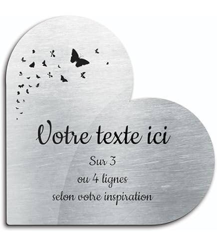 Fabriquée avec soin et expertise, cette plaque funéraire allie design esthétique et résistance durable. Générique Plaque Funéraire Coeur Personnalisée - Rose Granit Formats et couleurs Variés : Nos plaques à graver existent en 2 formats : petit ou grand., Motif colombe. Stop Pub Plaque Funéraire Personnalisée Pour Columbarium Avec Photo Gravée Sur Plaque Cimetiere Personnalisable Conçue en or ou argent brossé élégant, cette plaque apporte une touche de raffinement tout en symbolisant la paix et la sérénité grâce à son motif coeur délicatement gravé. Offrez un hommage unique, à l’image de vos souvenirs les plus précieux, avec une plaque gravée de qualité professionnelle, pensée pour durer et préserver la mémoire de vos proches avec dignité et élégance., Mode d'emploi 0 Plaque Funéraire Coeur Personnalisée avec Photo et Texte - Thèe Passions - Plaque Funéraire... Made in France : Depuis 20 ans, LCF fabrique de A à Z depuis son atelier à Dijon, en Bourgogne, des plaques de haute qualité entièrement personnalisées. Ultra-résistant : Très forte résistance aux intempéries, plaque traitée contre les UV. Plaque de columbarium personnalisée avec gravure de coeur Des surfaces aux effets métallisés alliées à une base acrylique permettent d‘obtenir l‘aspect du métal avec les avantages des plastiques. Épaisseur et matière : Épaisseur de la plaque en acrylique brossé est de 1,6 mm. Personnalisation Facile : Utilisez notre configurateur intuitif accessible via le bouton jaune Personnaliser maintenant. Description du produit Créez un hommage personnalisé et intemporel pour honorer la mémoire de vos proches avec notre plaque funéraire gravée en forme de coeur. Option supplémentaire : sans fixation, option dos autocollant (se colle sur toute surface lisse et propre avec son adhésif 3M double face intégré) ou option avec perçage, se fixe sur tout support.