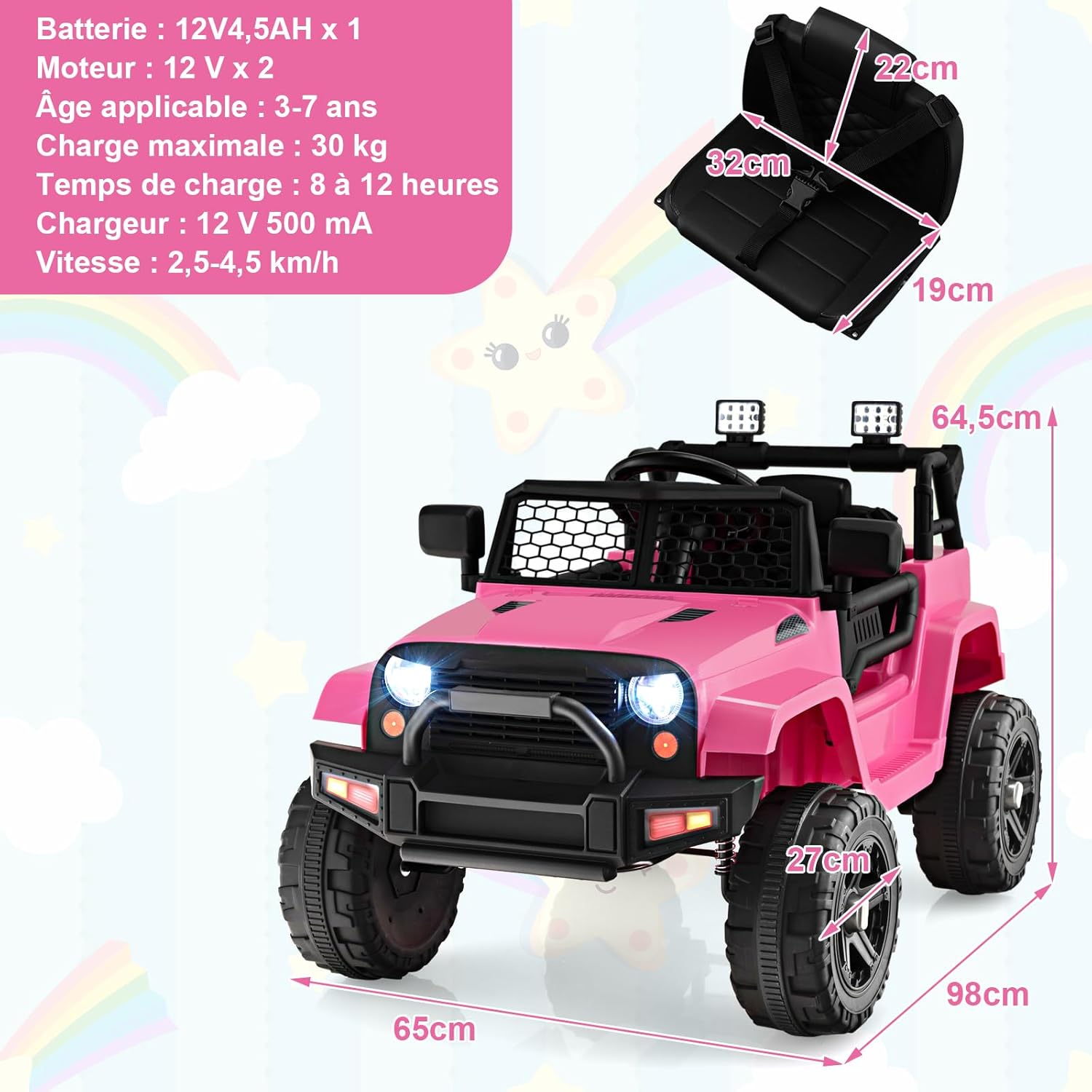 Quad électrique enfant 12v - v. 2-4km/h effets lumineux sonores Les pneus en EVA sont robustes et durables et peuvent empêcher les véhicules électriques des enfants de déraper. Batterie Rechargeable Pneus EVA Quad Électrique 12V Pour Enfants 3-7 Ans Avec Lumière Musiques Et Histoires 104x67x74cm Pour Différents Terrains Rose/Bleu/Noir/Rouge/Violet/Orange Voiture Electrique Enfants 2 Places Grâce à la fonction marche avant et marche arrière ainsi qu'au réglage de la vitesse (deux niveaux sur le véhicule et trois sur la télécommande), les enfants peuvent profiter du plaisir de conduire de manière autonome ou être guidés en toute sécurité par leurs parents. Ce quad électrique 12V est le compagnon parfait pour les petits aventuriers à partir de 3 ans. Son look tout‑terrain réaliste, ses 4 roues robustes et sa suspension offrent une véritable sensation de conduite sur différents types de sol (allée, cour, chemins plats Voiture Électrique Enfant Véhicule 12 V, Range Rover,Télécommande... 【Tableau de Bord Interactif】Ce quad électrique est équipé d'un tableau de bord interactif qui améliore l'expérience de conduite grâce à des options de divertissement passionnantes. 【Performances Exceptionnelles】 La voiture électrique à quatre roues est équipée de deux moteurs haute performance de 35 W et d'une batterie rechargeable de 12 V. Profitez d'un module d'apprentissage musical, d'un contrôle du volume, d'un indicateur de batterie et d'options de connexion telles que MP3, carte TF, USB et Bluetooth. Pour garantir la sécurité des enfants, la machine démarre lentement. Ce véhicule électrique offre jusqu'à 2 heures de conduite passionnante avec une seule charge. 【FONCTIONS DE SÉCURITÉ ET DE CONFORT】 Ce quad électrique pour enfants est équipé de fonctions de sécurité importantes afin de garantir une expérience de conduite sûre.