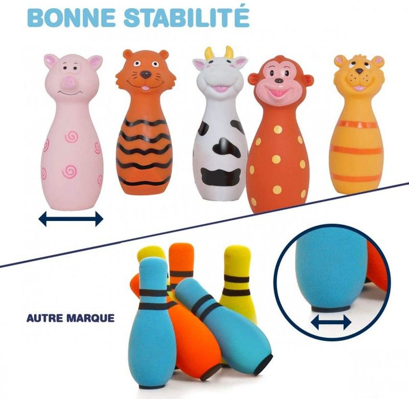 Convient aux enfants de tous âges : les tout-petits aiment les animaux mignons comme doudous, les plus grands enfants à partir de 3 ans s'amusent au bowling ou au quille 6 Cônes + 1 Balle Jeu De Quilles En Bois Pour Enfants - SMALL FOOT - Bunnies - Bois Massif - Intérieur - A Partir Jeu De Bowling Animaux Forêt Description du produit Le jeu de bowling Egmont Toys « Animaux de la forêt » est un plaisir de jeu charmant et sûr pour toute la famille. Ce superbe jeu de quilles animaux de la forêt avec leurs écharpes plaira à coup sûr à vos minis. Il peut être utilisé en intérieur car il est en tissu . Chaque quille contient un petit grelot. Aidez votre enfant à installer les quilles puis visez et lancez la balle pour faire tomber les quilles Idéal pour une utilisation en intérieur, que ce soit dans la chambre d'enfant, le salon ou la crèche. Grâce à son design adapté aux enfants et à ses matériaux de haute qualité, le kit de bowling n'est pas seulement un jouet, mais aussi un point fort décoratif. Découvrez le jeu de quilles Forêt d'Egmont Toys, fabriqué en coton naturel brodé. Idéal pour les enfants à partir de 12 mois, il favorise l'amusement et la... La balle souple et la finition stable assurent un plaisir de jeu durable, sans bruit fort ni risque de blessure. Les six cônes conçus avec amour en forme d'animaux de la forêt mignons – y compris le renard, l'ours, le lapin, etc. Ensemble de bowling doux en coton – 6 cônes d'animaux conçus avec amour et 1 balle en coton de qualité supérieure – Idéal pour jouer en toute sécurité sans risque de blessure. Jeu de quilles des animaux – Ludi - Juguetesland Ils sont fabriqués en coton doux et sont particulièrement maniables et sans danger. Jolis motifs d'animaux de la forêt : renard, ours, lapin et autres amis de la forêt ajoutent du plaisir et stimulent l'imagination.