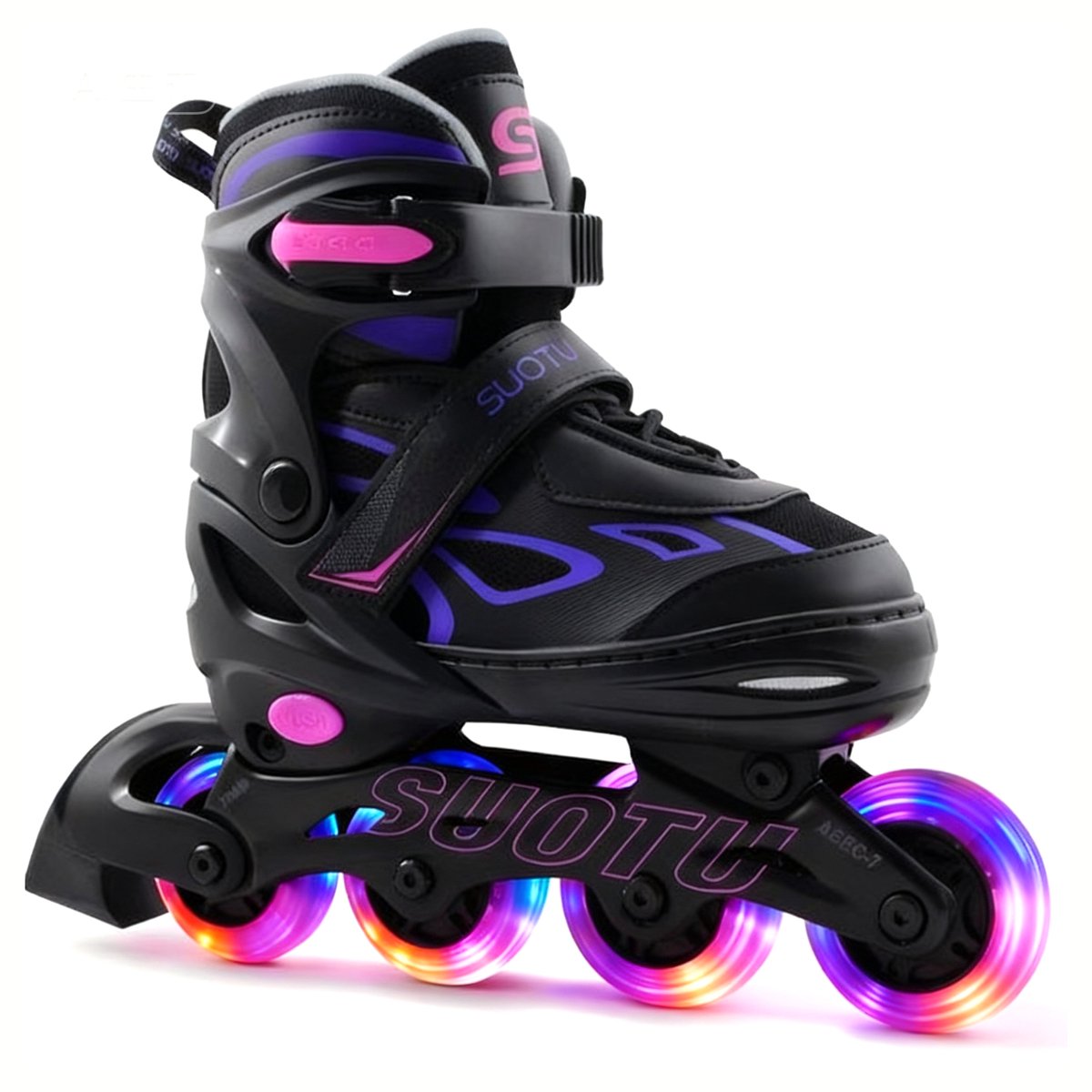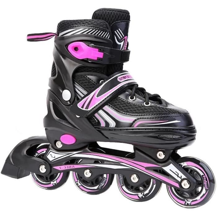 Patins à Roues Alignées Suotu - Taille 34-37 - Roues Lumineuses Patins Reglables Rose Grijs S La pointure indiquée par la flèche noire correspond à la pointure actuelle., 3., Relâchez le bouton « PUSH ». Rollers Fille Patins à Roues Alignées Ajustables Pour Filles Et Garçons Avec Roller Enfant Lumineux – Pas Besoin de Piles : Ce roller élégant est équipé de roues lumineuses intégrées et colorées qui s'allument automatiquement dès que vous commencez à patiner. Taille. S ( 28-31 EU ) · Couleur. Violet/Blanc · Marque. SUOTU · Matériau de la roue. Polyuréthane · Type de roue. Roue de patin · Matériau de la semelle Willonin® Roller en Ligne avec roulettes Clignotantes, Enfant Patins... Si vous n'êtes pas satisfait de nos rollers, n'hésitez pas à nous contacter. Les rollers SUOTU ne doivent pas être utilisés sur des surfaces mouillées, grasses, sales, sablonneuses ou glacées, et ne conviennent pas aux sauts, aux acrobaties ou à d'autres activités physiques intenses. Nous ferons de notre mieux pour résoudre votre problème. Lacets, sangles à 45° et boucles haute résistance offrent une triple protection, un maintien sûr de la cheville et une protection optimale pendant le patinage. Service Satisfaisant : SUOTU s'engage à fournir des produits de sport de plein air de haute qualité pour les enfants afin qu'ils puissent pratiquer ce sport. Qualité et Sécurité : Châssis monobloc, roues en polyuréthane (PU) 82A à roulement fluide, roulements ABEC-7 de haute qualité, châssis en aluminium et embouts en caoutchouc (TPR).