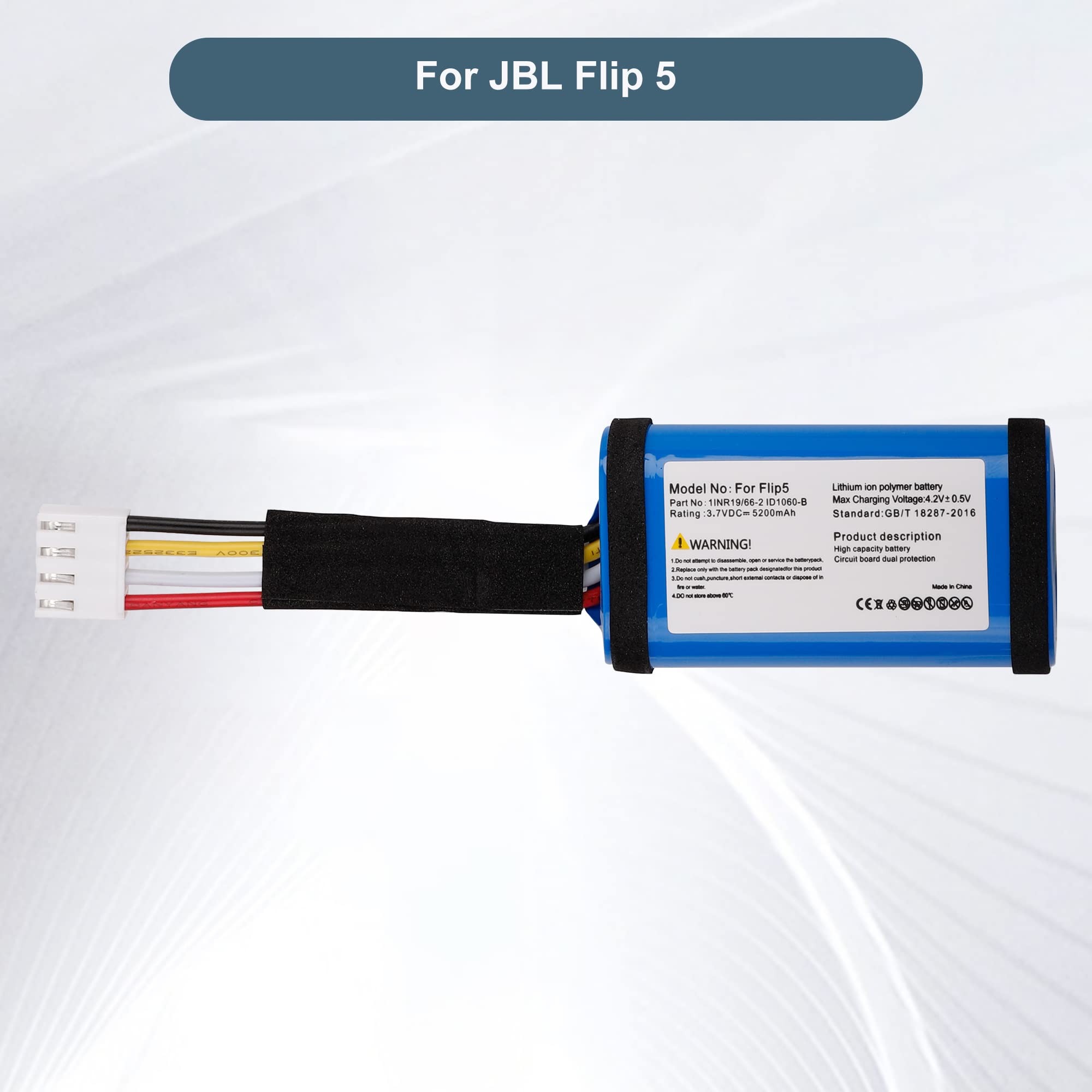 Lors de l'installation, assurez-vous que la prise est correctement connectée à votre appareil. ENCEINTE PORTABLE BLUETOOTH JBL FLIP 5 ÉTANCHE - SAND Veuillez donc comparer les connecteurs de votre batterie d'origine avec les connecteurs sur notre photo. Jbl Flip 5 FYIOGXG Cameron Sino Batterie Pour JBL Flip 6, JBLFLIP6BLUAM, JBLFLIP6REDAM JBL GSP-1S2P-F6D 5200 MAh / 19,24 Wh Batterie Compatible JBL SUN-INTE-152 Précautions d'emploi : Vérifiez soigneusement le numéro de modèle de votre appareil et le numéro de pièce de votre batterie d'origine pour déterminer si cette batterie est compatible avec votre appareil. Veuillez utiliser un chargeur légitime pour charger l'appareil afin d'éviter d'endommager la batterie et l'appareil. Grande capacité de 5200 mAh pour une durée de jeu plus longue. · Entièrement compatible avec les haut-parleurs JBL Flip 5 et 5ème génération. · Conception sûre... Nous continuerons à vous servir jusqu'à ce que vous soyez satisfait. Batterie de rechange pour JBL Flip 5 : cette batterie est entièrement compatible avec la batterie JBL SUN-INTE-152, JBL 1INR19/66-2, JBL ID1060-B. Le JBL Flip 5 vous offre une expérience audio unique, surtout avec la batterie Li-ion de 5200 mAh de Fayerkar. Pour ceux qui souhaitent prolonger encore plus la fête, une batterie de rechange 6800 mAh compatible avec le JBL Flip 6 est disponible Batterie de rechange entièrement compatible pour JBL : cette batterie est entièrement compatible avec JBL Flip 5, compatible avec les haut-parleurs Bluetooth JBL Flip 5ème génération. 【Batterie de capacité supérieure pour JBL】Type de cellule : Li-polymère | Capacité : 5200 mAh | Tension : 3,7 V | Énergie nominale : 19,24 Wh. Remarque : la polarité varie selon l'année de fabrication. Informations sur le produit : Spécifications de la batterie : 3,7 V/5200 mAh/19,24 Wh. Les câbles rouges sont situés à gauche lorsque l'on regarde le haut de la chaussure de contact avec les 5 contacts.