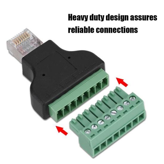8 Pins Connecteur adaptateur pour câble réseau RJ45 8P8C CAT5e Technologie de borne à vis sans soudure] - Notre adaptateur RJ45 ne nécessite aucune soudure, ce qui facilite le réglage des fils. Compatible avec les fils monobrins et multibrins, il vous suffit de desserrer les borniers à l'aide d'un petit tournevis, d'insérer le fil et de le resserrer Adaptateur Borne RJ45 Adaptateur De Borne à Vis Pour Montage Sur Panneau RJ45 2 Pièces Adaptateur RJ45 Borne à Vis Note: réflexion de lumière et différents écrans peuvent causer la couleur de l'article dans un peu différente de la vraie chose. Le terminal à sur panneau RJ45/8P8C a une taille d'installation standard de type D et convient à divers scénarios. SAL Adaptateur RJ45 vers borne à vis Adaptateur RJ45 mle femelle à 8... L'erreur de mesure permis est de +/- 1-3 cm. Utilisez simplement un tournevis pour ouvrir le bornier, faites glisser le toronné ou solide et resserrez. Fournit une connectivité Ethernet Cat5E pass-through pour les données dans les environnements industriels. Le câblage de l'adaptateur est conforme à la de câblage structuré EIA/ 568B, qui peut connecter des câbles réseau externes, transmettre des signaux réseau et mieux protéger les interférences électromagnétiques.