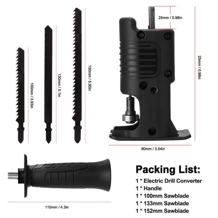 Cet adaptateur léger et portable, combiné à son processus d'installation facile, vous permet de vous attaquer rapidement et efficacement aux tâches de coupe. Adaptateur convertisseur de perceuse électrique noire vers scie à... et fiable] : fabriqués à partir d'un matériau ABS de haute qualité, la tête du convertisseur et le boîtier de la poignée sont conçus pour durer. Compatible avec tous les types de perceuses, ce kit permet une conversion sans effort et étend les capacités de vos outils existants Tronçonneuse Electrique Akozon Adaptateur Scie Alternative Pour Perceuse Électrique, Accessoire Scie A Main Lame Amovible [Manipulation confortable] : bénéficiez d'un contrôle et d'un confort optimaux tout en travaillant avec la poignée auxiliaire amovible. Spécification :Type d'article : adaptateur de scie alternativeMatériau : ABSProfondeur de coupe du tuyau : env. Fixez simplement l'adaptateur à votre perceuse, insérez la lame de scie souhaitée et commencez à couper du bois, du métal ou du plastique en toute simplicité Investissez dans outil qui fournira constamment des performances fiables chaque fois que vous en aurez besoin [Ensemble complet] : obtenez tout ce dont vous avez besoin dans seul paquet. 20 mm/0,8 poucesChamp d'application : pour la coupe du bois, du métal et du plastiqueListe des colis :1 adaptateur de tronçonneuse1 x poignée3 x Lames de scieRemarque :Veuillez noter que le nouveau type et l'ancien type de ce produit seront envoyés au hasard, et assurez-vous que cela ne vous dérange pas avant de commander. [Efficacité améliorée] : dites adieu au sciage manuel et bonjour à une efficacité de travail accrue ! HURRISE Tête de conversion de scie électrique Kit Adaptateur de... 10 mm / 0,4 poProfondeur de coupe du bois : env. Avec cet ensemble complet, vous aurez les outils nécessaires pour aborder divers projets et obtenir des résultats de niveau professionnel. Adaptateur de scie alternative, ensemble d'adaptateur de scie