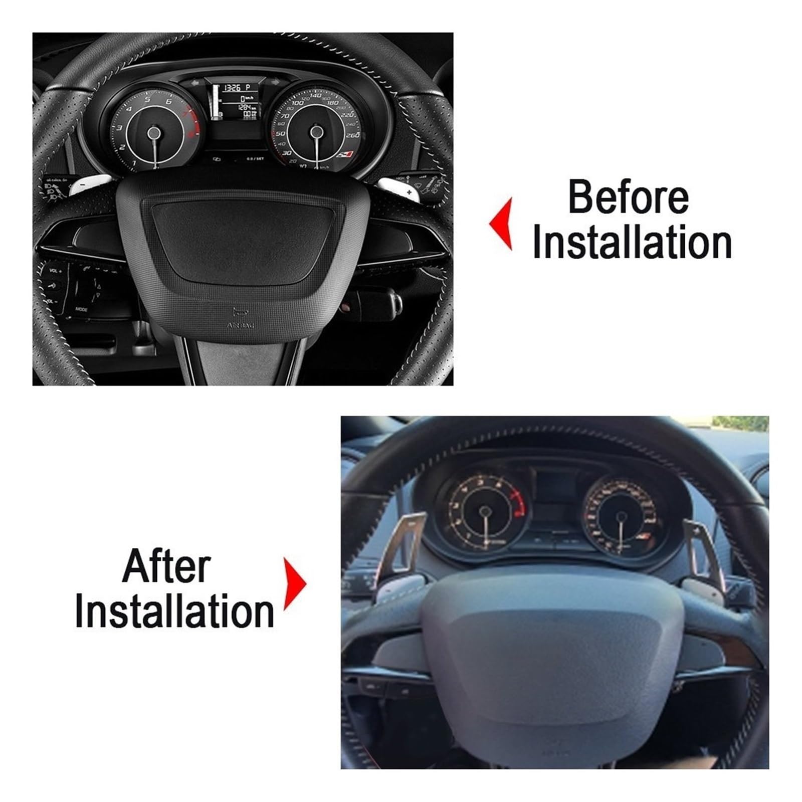 Palettes Raccord Cupra FR Boite A Vitesse Pour SEAT IBIZA 6J FR BOCANEGRA 02R300042P Améliore Contrôle Changement Vitesse Palette De Changement De Vitesse Pour Seat Leon ST 5F Cupra Ateca Ibiza 6P Arona Tarraco Alhambra, Extension De Volant De Voiture, Autocollant DSG Volant Palettes Extension de Shifter pour Seat Leon Cupra 5f Ibiza 6f... Spécification:Nom du produit : Palettes de changement de vitesseMatériau : plastique ABS et alliage d'aluminiumCouleur : rouge, noir, argent, bleuTaille : 138*44*31 mmConvient pour :Pour Seat Ibiza 6J SC Cupra FR Bocanegra 2010 2011 2012 2013 2014 2015Le forfait comprend: 2 pièces/ensemble (une paire, gauche et droite)REMARQUE: Ne peut être utilisé que pour les véhicules avec fonction volant + / -Veuillez vous assurer qu'il convient à votre voiture avant de passer une commande. Technologie et popularité : En tant que configuration tendance des voitures modernes, les palettes de changement de vitesse soulignent le sens de la technologie et de la sportivité du véhicule et améliorent la qualité de l'ensemble du véhicule Vous pouvez contrôler votre voiture à tout moment, sans appuyer sur l'embrayage. Contrôle précis de la vitesse : dans les scénarios où un contrôle précis de la vitesse est nécessaire, comme la conduite sur route de montagne et le suivi d'une voiture, le conducteur peut utiliser les palettes de changement de vitesse pour changer de vitesse à temps afin d'obtenir un contrôle de vitesse plus précisIl s'agit d'une paire d'extensions de palettes de volant pour Seat Ibiza (6J 2009-2015) et son installation est facile et rapide grâce à un adhésif double face. Installation: Le ruban adhésif double face assure une connexion étanche entre la rallonge et la palette. Fonctionnement pratique : Situé derrière le volant, vous pouvez changer de vitesse sans quitter le volant, ce qui facilite la conduite Forte adaptabilité : compatible avec tous les types de volants, facile à installer et peut facilement améliorer l'expérience de contrôle du véhicule Extensions Palette au volant Alu Seat
