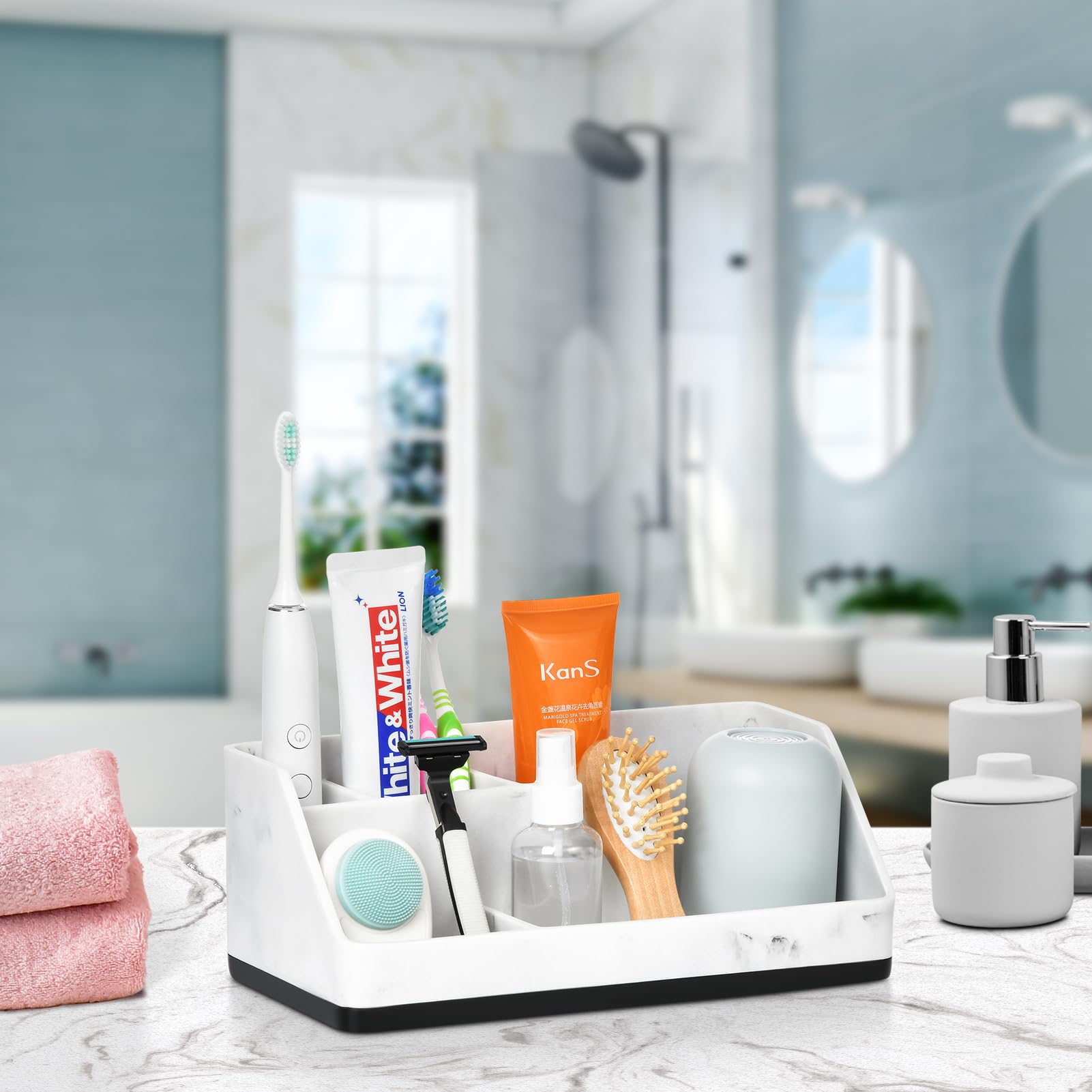 Nos ventouses uniques sontparfaites pour les appartements et les propriétés locativesConseils : Ce puissant porte-brosse à dents de salle de bain fonctionne mieux sur les surfaces non poreuses, imperméables et lisses, telles que le verre, les miroirs, le métal poli, l'acier inoxydable, les plaques en plastique, le carrelage, le granit,etc... Vidange automatique : Cet organisateur de salle de bain en résine est équipé de 4 pieds antidérapants, suffisamment lourds pour ne pas tomber. Haute qualité : Ce modèle imite les motifs de marbre sur les surfaces solides en résine, ce qui rend notre boîte de rangement de salle de bain plus belle. Rangement Brosse à Dents Rebrilliant Porte-brosse à Dents Pour Salle De Bain Porte-dentifrice Organisateur Salle De Bain 5 Fentes Accessoire de salle de bain : Vous pouvez ranger les brosses à dents, le dentifrice, les rasoirs, les peignes, les tondeuses à sourcils et les outils de maquillage, toutes sortes de cosmétiques, la papeterie ou les fournitures de cuisine. Multifunctional Home Office Bathroom Accessory]Vous pouvez stocker des brosses à dents, du dentifrice, des rasoirs, des peignes, des tondeuses à sourcils et des outils de maquillage, toutes sortes de cosmétiques, de papeterie ou de fournitures de cuisine Imperméable et robuste : Le porte-brosse à dents avec 5 fentes est fabriqué en résine, imperméable à l'eau et durable, il n'est pas facile à craquer pour une utilisation à long terme. Porte Brosse à Dent Ikea Porte Brosse à Dents En Bois | 5