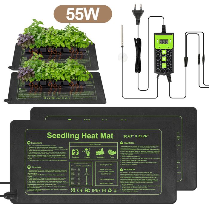 Germination Graines Chauffante Tapis Chauffant Root!T Hobby 60W - Pour Des Plantes Qui Poussent Plus Vite ! Thermostat Intégré Horticulture Technologie de chauffage efficace: La technologie de chauffage infrarouge lointain de notre tapis chauffant pour plantes peut chauffer la zone des racines à 10-20°F (5-10°C) au-dessus de la température ambiante, créant ainsi des conditions optimales pour une germination et une croissance accélérées Apritsce Tapis Chauffant pour Plantes avec Thermostat, Serre... Accessoire Serre Intérieure Pour Semis Avec Thermostat Numérique Plantes D Tapis Chauffant Plage de température réglable: La température peut être librement réglée entre 20 °C (68 °F) et 45 °C (113 °F). Il est recommandé de maintenir la température entre 5°C/41°F et 45°C/113°F Tapis chauffant imperméable pour plantes, serre de germination... Peut ajuster la température de croissance appropriée en fonction des besoins des différents environnements d'utilisation. Le fond du coussin chauffant est doté d'une double isolation haute tension, et le fil chauffant est entièrement recouvert, garantissant une sécurité optimale lors d'une utilisation prolongée La couche de surface en PVC recouvre complètement le fil chauffant, garantissant qu’il n’y a aucun risque de sécurité lors d’une utilisation continue., ATTENTION : 1., NE PAS immerger le tapis chauffant dans l'eau., 2., Ne pas l'utiliser sur des surfaces rugueuses, abrasives ou tranchantes., 3., Ne pas l'utiliser pour réchauffer des personnes Application polyvalente: Notre tapis chauffant pour plantes peut non seulement réchauffer les semis, améliorer le taux de germination et le taux de stockage des semis, de plus, ce tapis chauffant peut également être utilisé comme source de chaleur idéale pour alimenter les terrariums, les reptiles et les serres intérieures pour répondre à vos différents besoins quotidiens