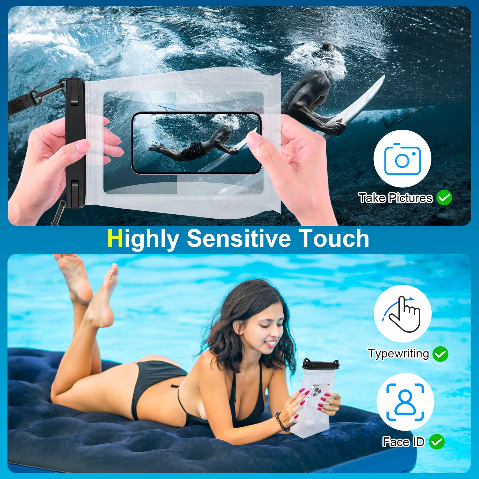 2 Pochettes Étanches Flottantes, pour iPhone 13-12-11 Mini Pro XS XR X Conception flottante triangulaire - grand étui de téléphone étanche fait d'un design triangulaire spécial qui agrandit la capacité supplémentaire pour tous vos petits objets tels que l'argent, la batterie externe, les lunettes de soleil, la crème solaire, le rouge à lèvres, les mouchoirs, les clés de voiture, les montres... étui étanche Toucher Fonctionnel Iphone 15 Pro Max 1 To Neuf Pochette étanche Pour Téléphone Portable - Sac étanche Pour Téléphone Iphone 16 Pro Max 1 To Neuf Cachette Secrete Compatible avec Apple iPhones 16 15 14 13 12 11 Pro Max Plus Mini SE Xs Xr X 8 7 SE promax & Samsung Galaxy FE S22 S21 S10 S9 S10E Note 10 9 8 Edge Mate A71 A51 & Android Google Pixel 6 5 5A 5G 4Xl XL LG & HTC Asus Moto Alcatel Acer Microsoft etc. Le sac de téléphone étanche peut flotter, le support de téléphone étanche fait flotter votre téléphone portable pour éviter de laisser tomber vos objets de valeur dans l'eau. UCHODURA Pochettes Flottantes Étanches pour Téléphone Portable... Pochette étanche IPX8 flottante - La pochette étanche pour téléphone utilise un double système d'étanchéité, une fermeture à glissière scellée et une pince de verrouillage en plastique, elle est plus sûre que les autres sacs étanches; protection étanche jusqu'à 32 pieds (10 mètres) sous l'eau, pas de soucis pour vos objets de valeur mouillés, la pochette étanche est IPX8 étanche/anti-neige/anti-poussière. Sensible au toucher et prendre des photos - Le sac de téléphone étanche est conçu avec un PVC transparent, il est facile de visualiser et d'utiliser rapidement votre smartphone, la réponse de l'écran tactile est assortie, vous pouvez envoyer des messages, passer des appels, regarder des vidéos, identifier le visage et prendre photos/vidéo à travers un sac étanche ; [Veuillez noter : Touch ID n'est pas pris en charge, et veuillez évacuer l'air dans le sac avant utilisation pour éviter d'affecter l'écran tactile]. Veuillez nous contacter librement pour tout problème, nous le résoudrons pour vous dès que possible. Conseils : veuillez tester la fonction imperméable avec une serviette en papier avant chaque utilisation, plongez dans l'eau pendant environ 10 minutes.
