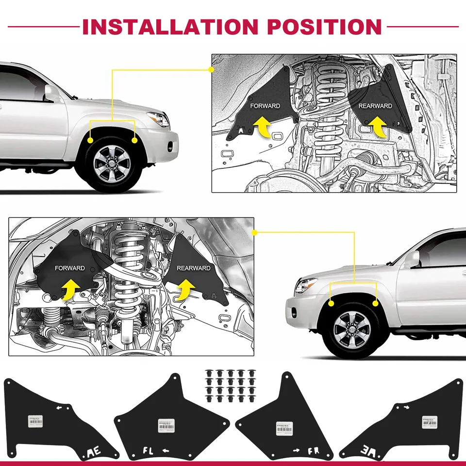 Protections Ailes Caoutchouc J120 J150 Garde-boue Pour Toyota Land Cruiser Prado J120 J150 FJ Cruiser Pare Eclaboussures Garde Boue Doublures~p138244741 Accessoire Voiture 4x4 Sans Outils Au printemps, en été, en automne ou en hiver, ces garde-boue minimisent les risques de rayures dues à la poussière, à la boue, au gravier, à la saleté et autres corps étrangers présents sur les pneus, offrant ainsi une protection complète à votre véhicule Toyota Land Cruiser (HDJ90) Garde-boue avant, 10,00 Fabriqué dans un matériau durable, garantissant que les ailes ne se déformeront pas ou ne se fissureront pas après une utilisation à long terme. Compatibilité : Pour Toyota Land Cruiser Prado J120 J150 2003-2020 Pour Toyota Land Cruiser (Europe) 2003-2020 (LC3 LC4 LC50) Référence OE : 53735-35150, 53736-35150, 53886-35020 Doublures de garde-boue/Joint de garde-boue Avec clips de fixation gratuits Ajustement garanti Caoutchouc EVA de haute qualité, durable, résistant aux... Les ailes peuvent empêcher la boue et l'eau de pénétrer dans les roues et réduire le contact entre les roues et la route boueuse, améliorant ainsi la stabilité du véhicule. Équipement:Pour Land Cruiser Prado J120 J150 2003 2004 2005 2006 2007 2008 2009 2010 2011 2012 2013 2014 2015 2016 2017 2018 20119 2020Pour Land Cruiser (Europe) 2003 2004 2005 2006 2007 2008 2009 2010 2011 2012 2013 2014 2015 2016 2017 2018 20119 2020 (LC3 LC4 LC50)Pour FJ Cruiser2007 2008 2009 2010 2011 2012 2013 2014Numéro de pièce de référence : 53735-35150, 53736-35150, 53886-35020., Matériel: Caoutchouc EVALa couleur noireEmballage inclus:4 x joint de garde-boueClips/16 pièces-ensembleCaractéristiques:1., Protégez les sourcils des roues de la boue, de la saleté, des rayures et d'autres dommages externes., 2., Assez flexible pour se conformer à différents types de carrosserie., 3., Facile à installer, aucun outil n'est nécessaire4., Belle protection de sécuritéAméliorez l'apparence de votre voiture avec nos élargisseurs d'ailes. Ces protections de passage de roue de voiture améliorent votre véhicule avec un look rafraîchissant. Les ailes de voiture sont conçues pour être facilement installées sans avoir besoin d’outils spéciaux.